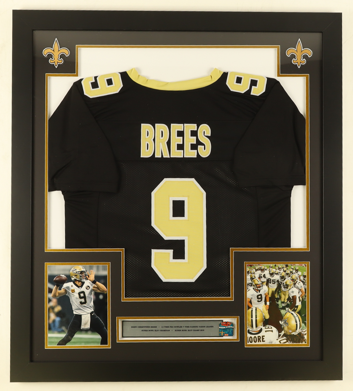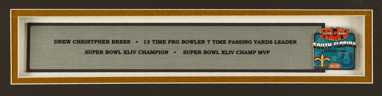 Custom frame measures approximately 33” x 37” in size and features an unsigned jersey for Drew Brees (New Orleans Saints). The display also includes an official XLIV pin as well as (2) cloth team logo patches. Please note, the display is unsigned.