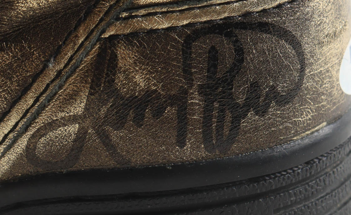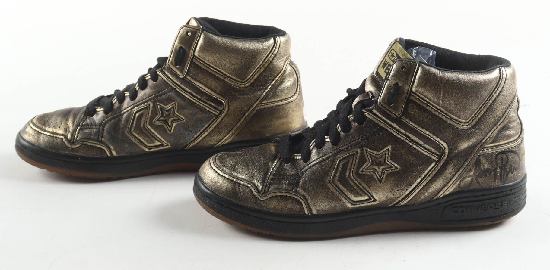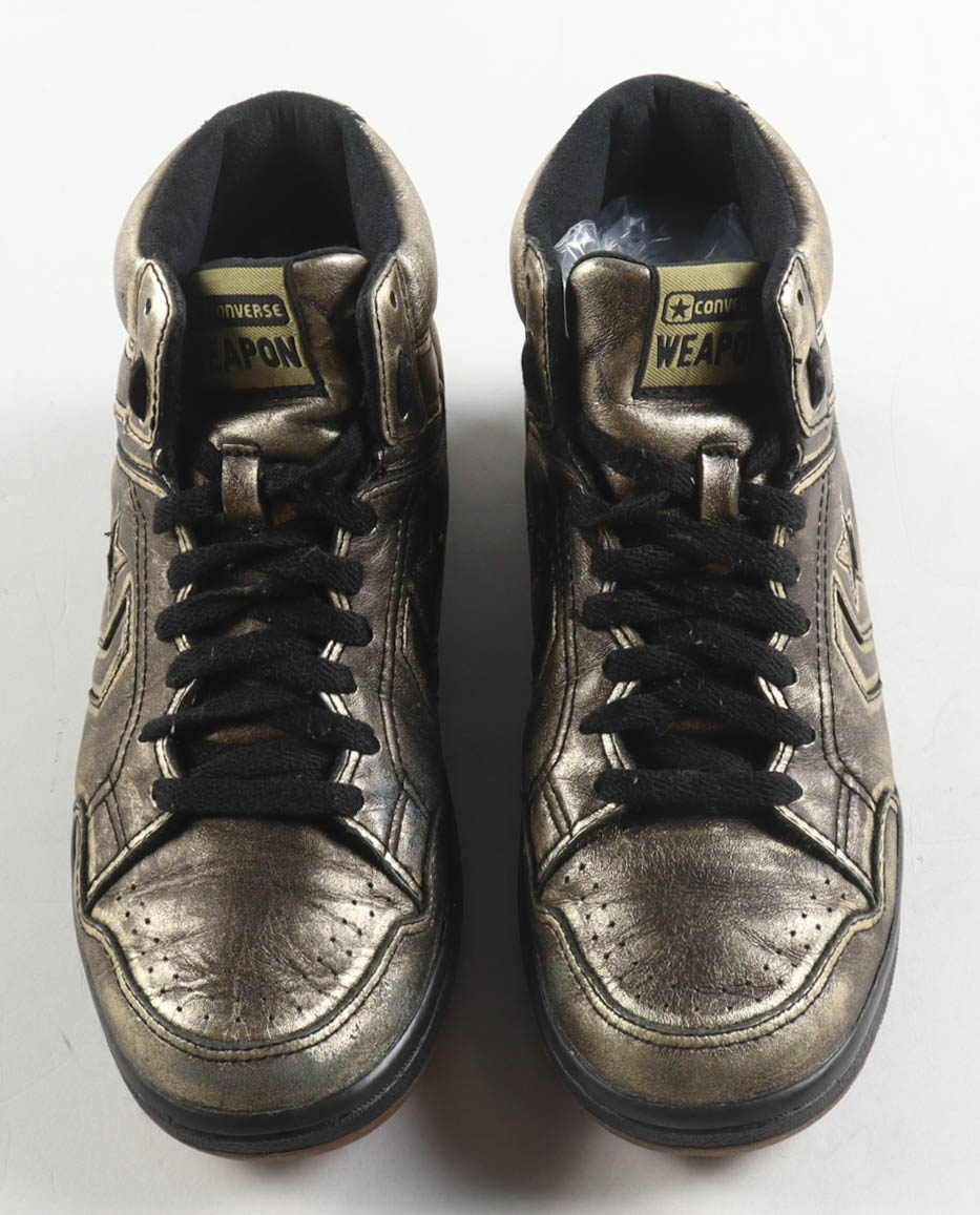 Pair of (2) Converse Weapon Gold Leather Basketball Shoes. Hand-signed by Magic Johnson (Los Angeles Lakers, HOF) and Larry Bird (Boston Celtics, HOF). Please refer to photos for more details. Display case included as shown.