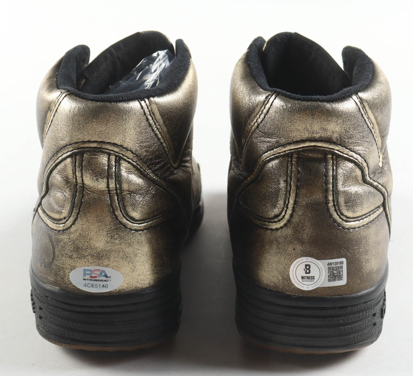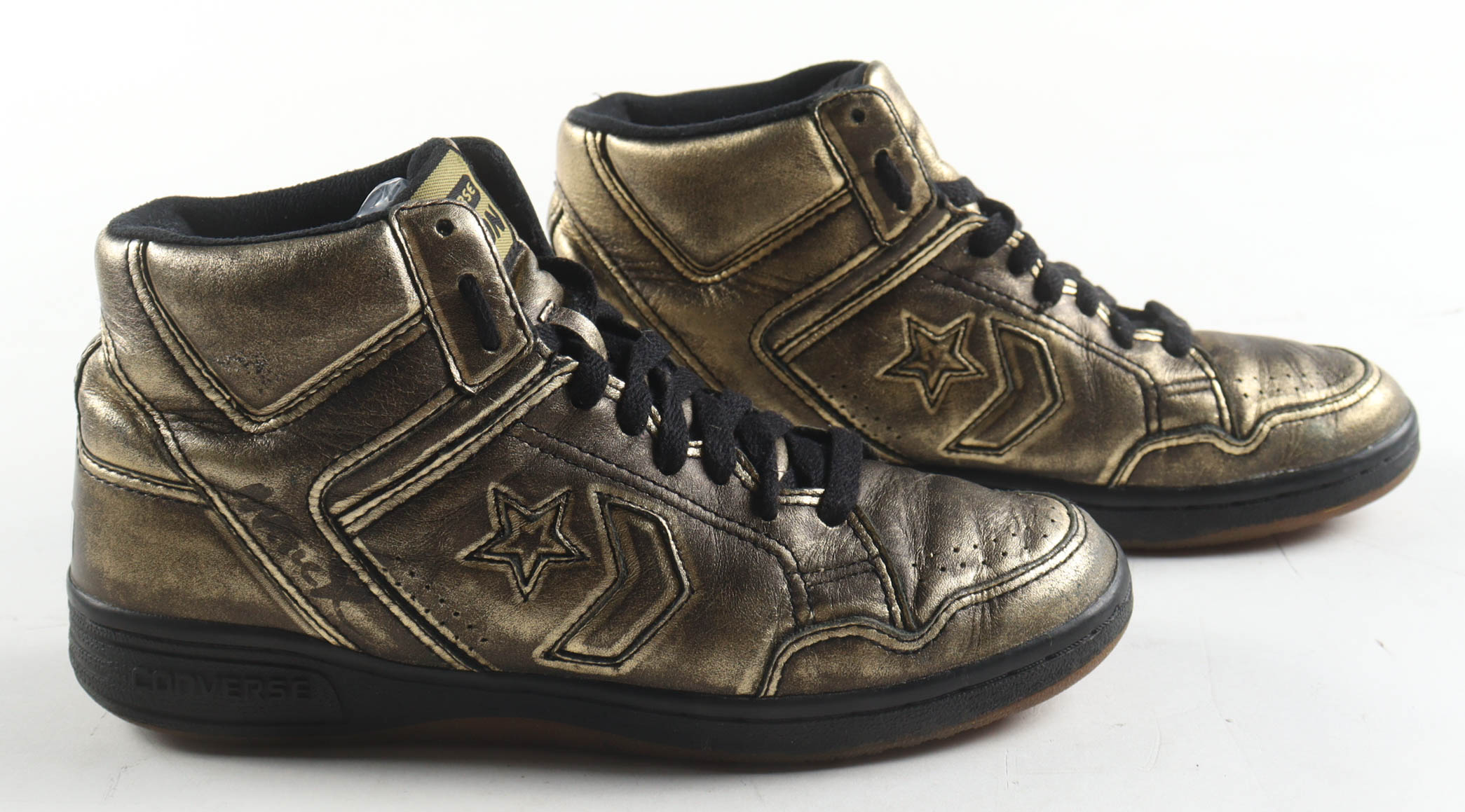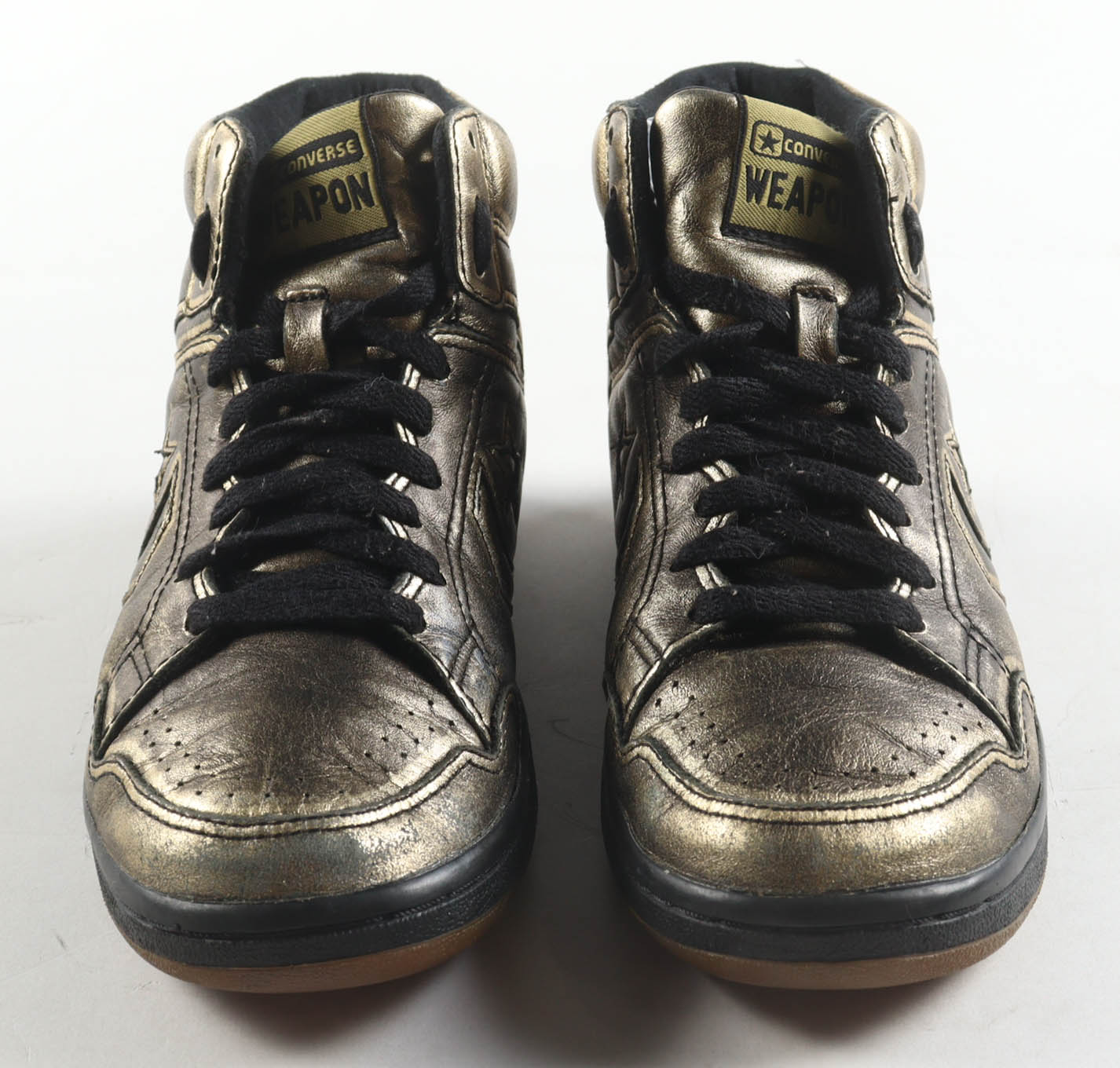 Pair of (2) Converse Weapon Gold Leather Basketball Shoes. Hand-signed by Magic Johnson (Los Angeles Lakers, HOF) and Larry Bird (Boston Celtics, HOF). Please refer to photos for more details. Display case included as shown.