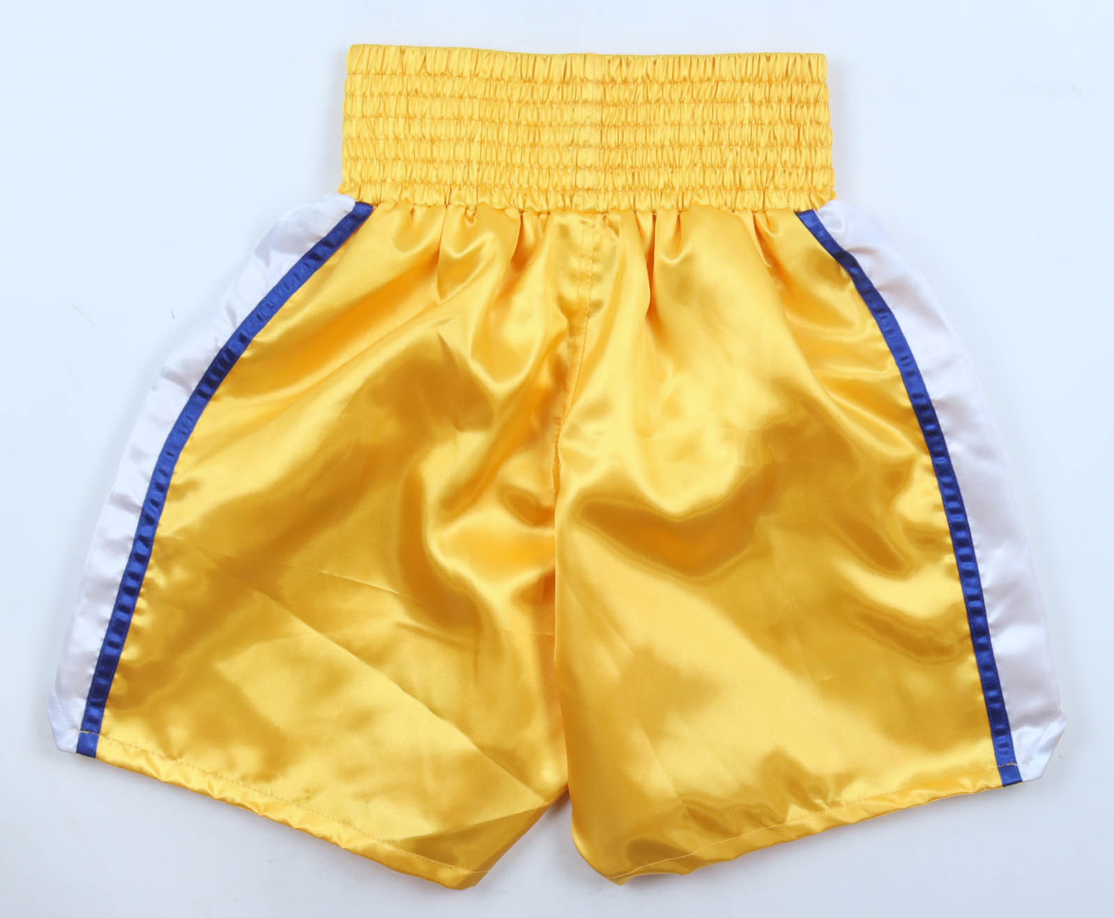 Custom boxing shorts have been hand-signed and inscribed by Thomas Hearns (HOF). Please note, the signature has bled.
