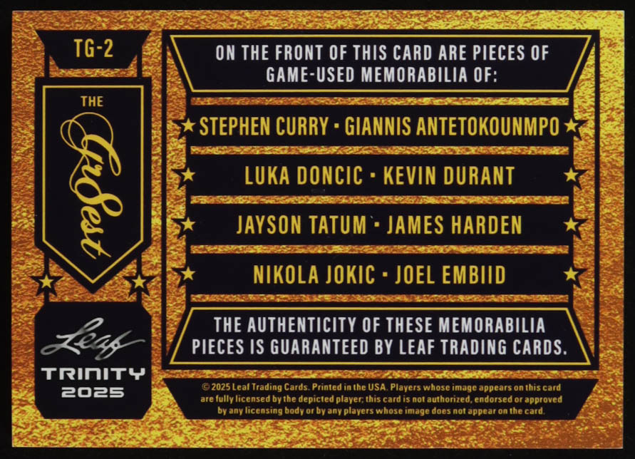 2025 Leaf Trinity The Gr8est #TG-2 #2/3 Stephen Curry / Giannis Antetokounmpo / Luka Doncic / Kevin Durant / Jayson Tatum / James Harden / Nikola Jokic / Joel Embiid
