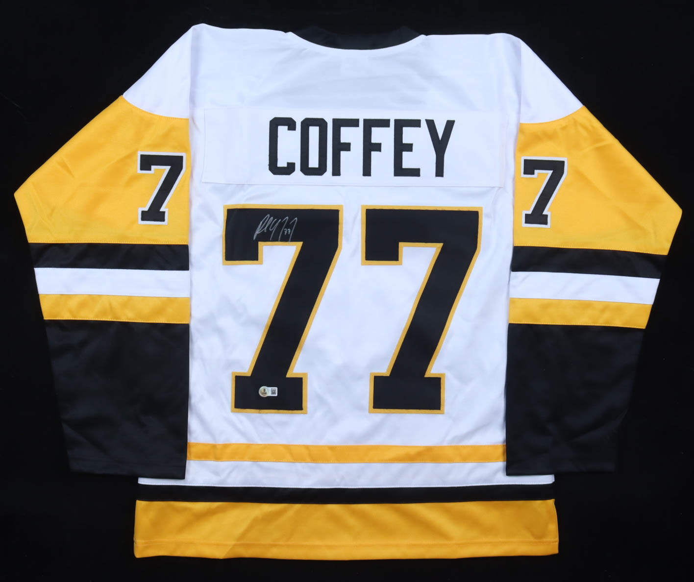Custom jersey with everything sewn on, size XL. Hand-signed by Paul Coffey (HOF).