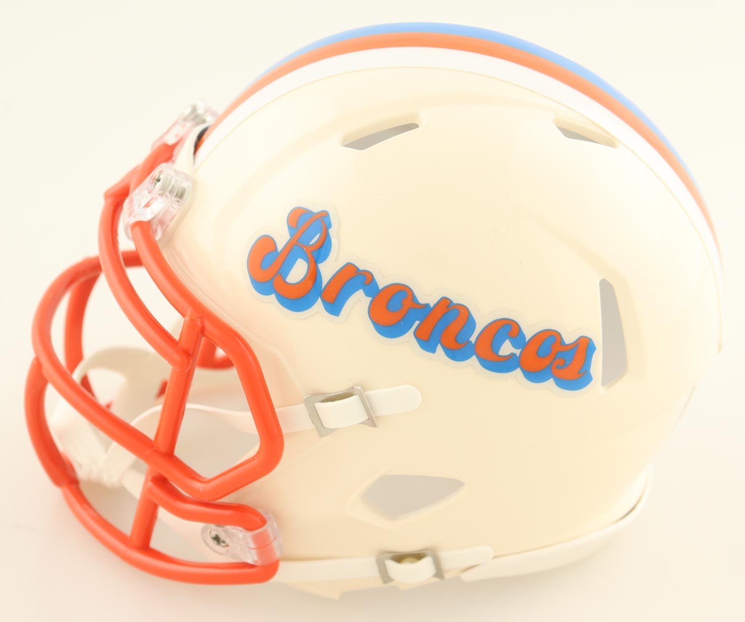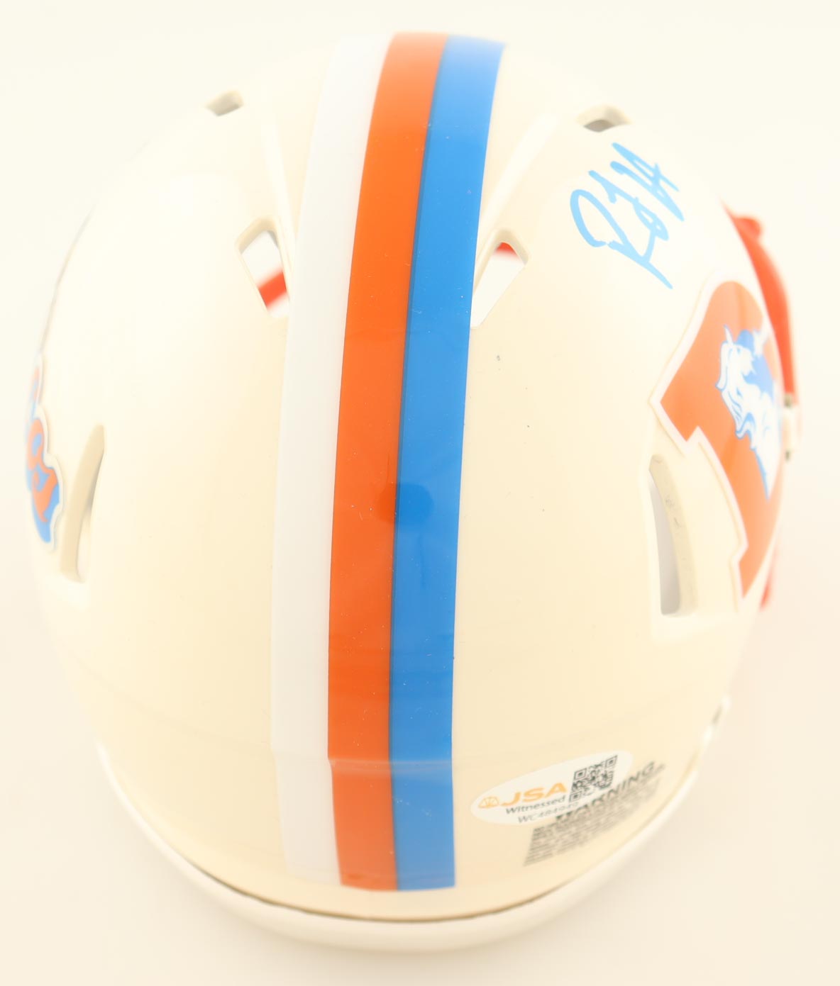 Riddell Denver Broncos Retro Alternate speed mini helmet has been hand-signed by RJ Harvey.