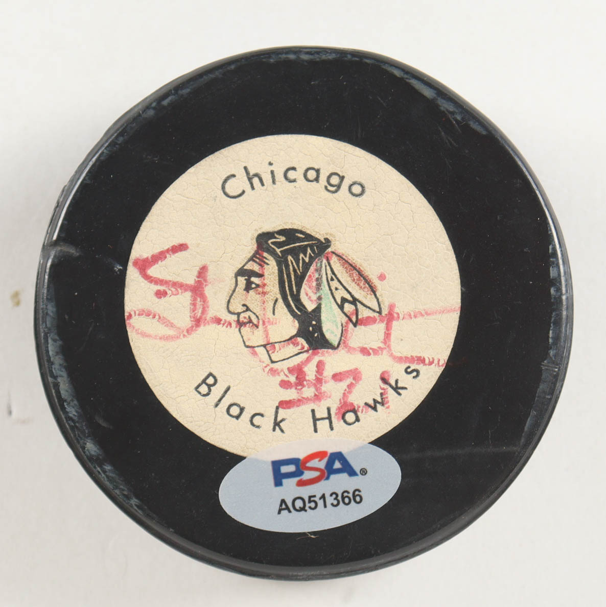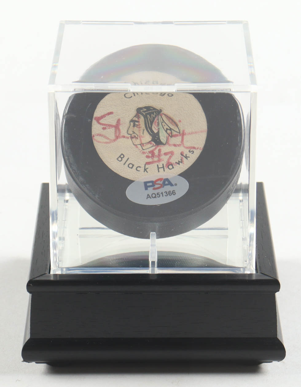 Stan Mikita Signed Black Hawks Logo Hockey Puck In Display Case (PSA)