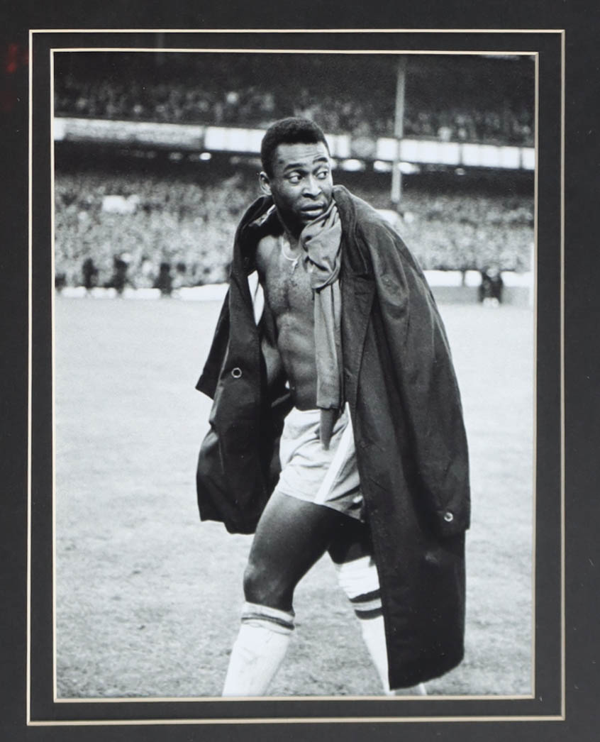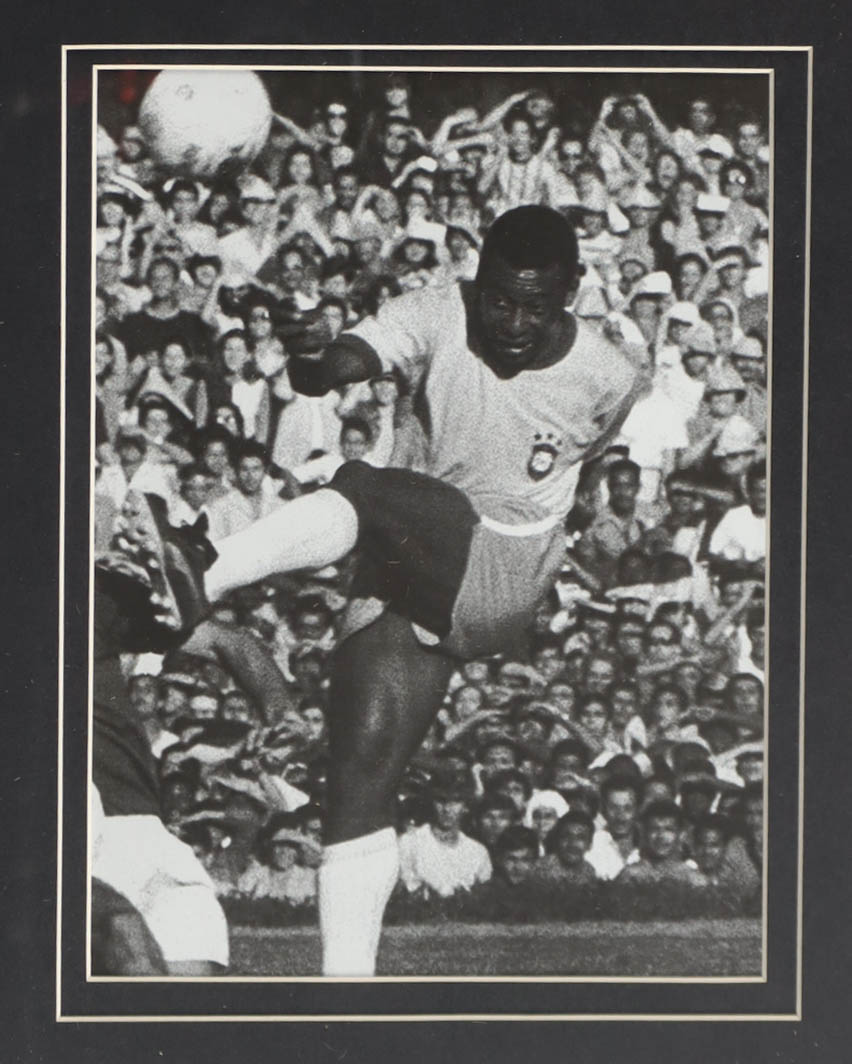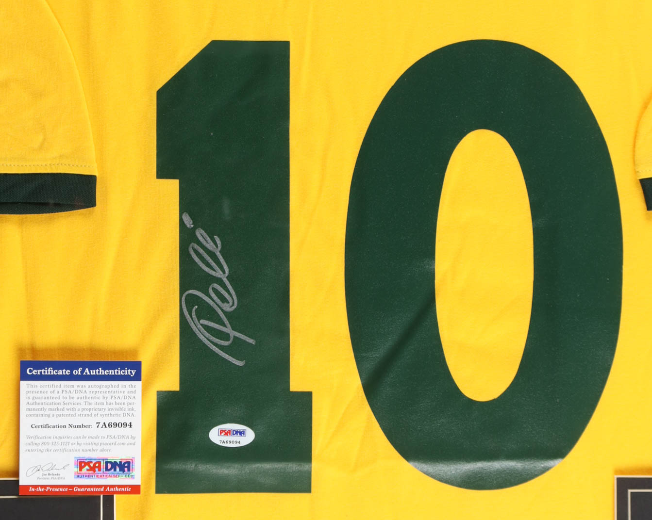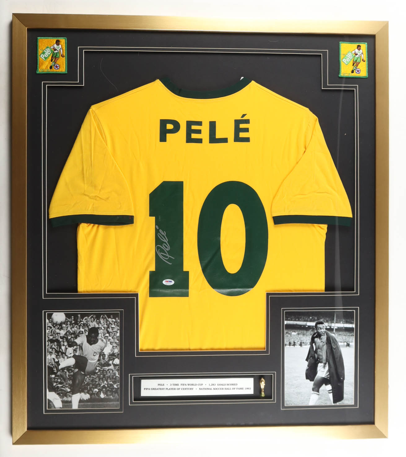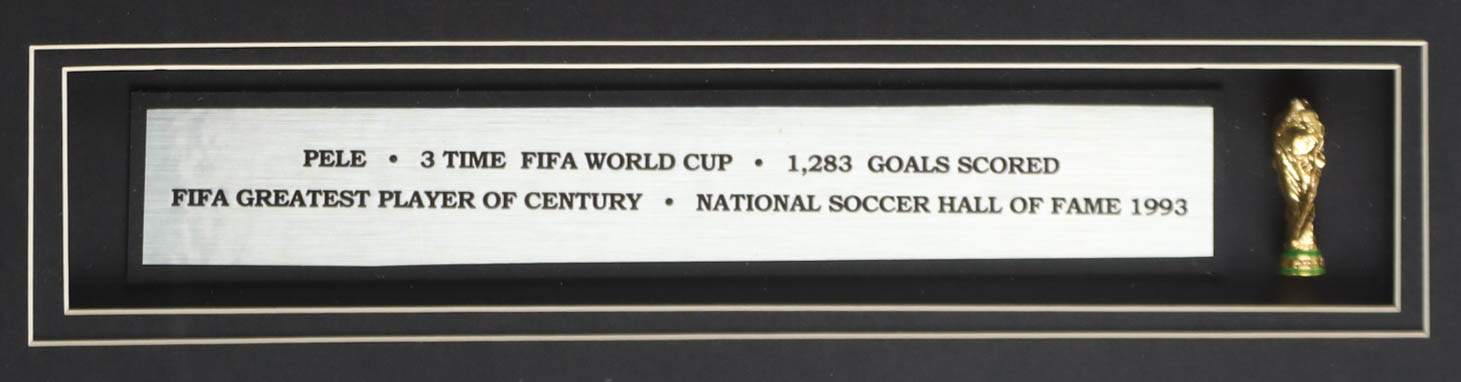Custom frame measures 32" x 36" in size and features a jersey that has been hand-signed by Pele (D. 2022, HOF). Display also features (2) 8" x 10" photos, mini trophy pin, title plaque and (2) cloth team logo patches with a full career statistics plaque.