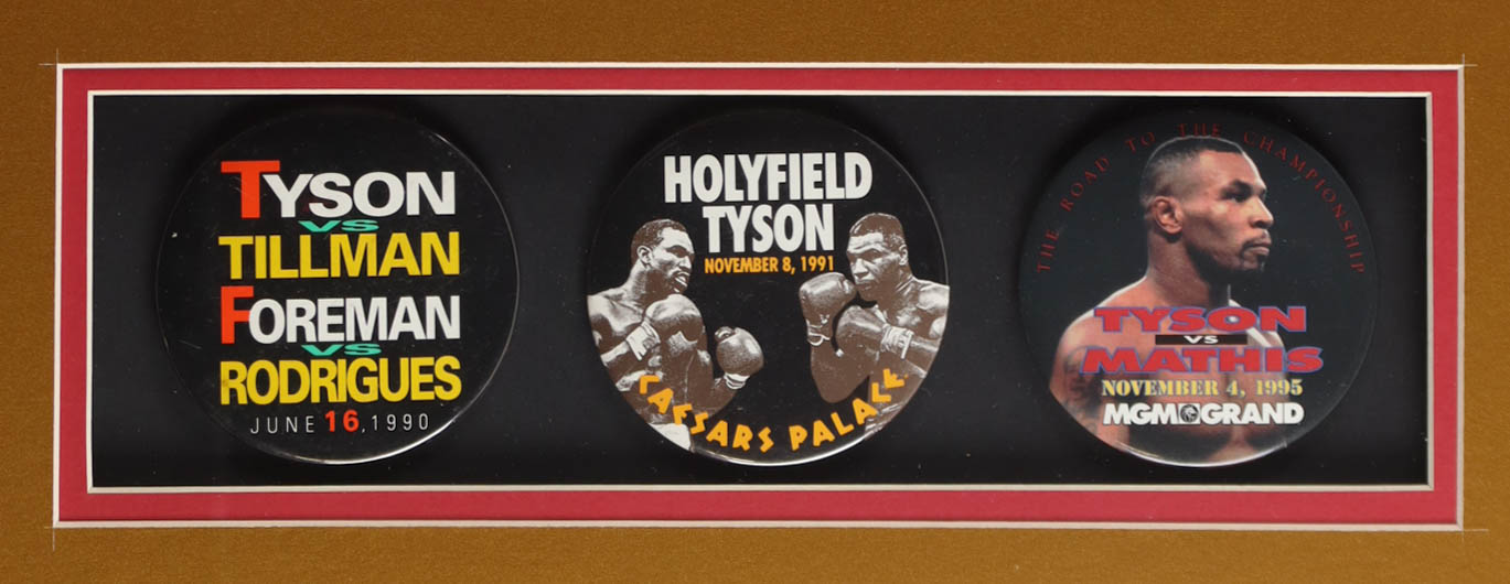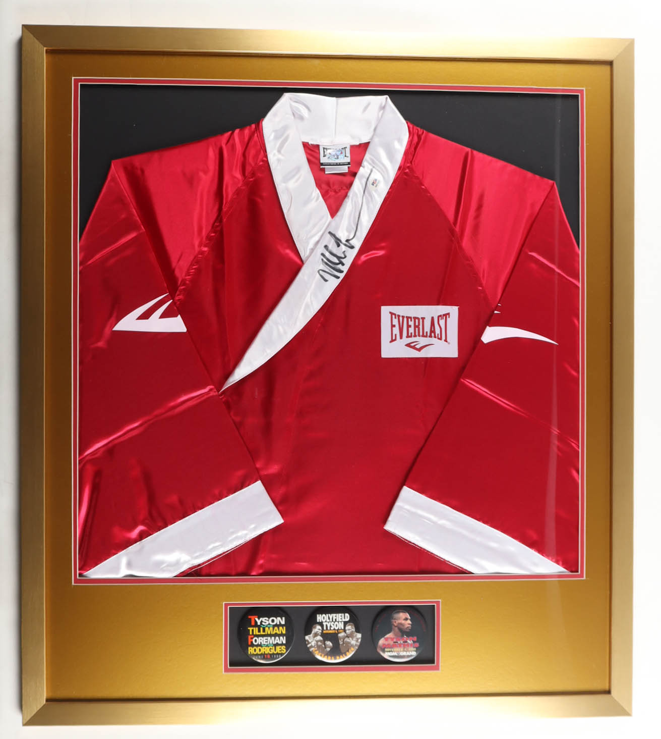Custom frame display measures approximately 32" x 36" in size and features an Everlast boxing robe that has been hand-signed by Mike Tyson (HOF). The display also includes (3) vintage original fight pins. Please see photos for more details regarding the condition of the item.
