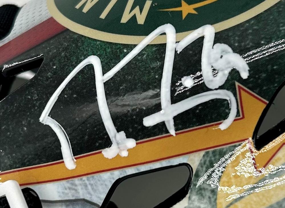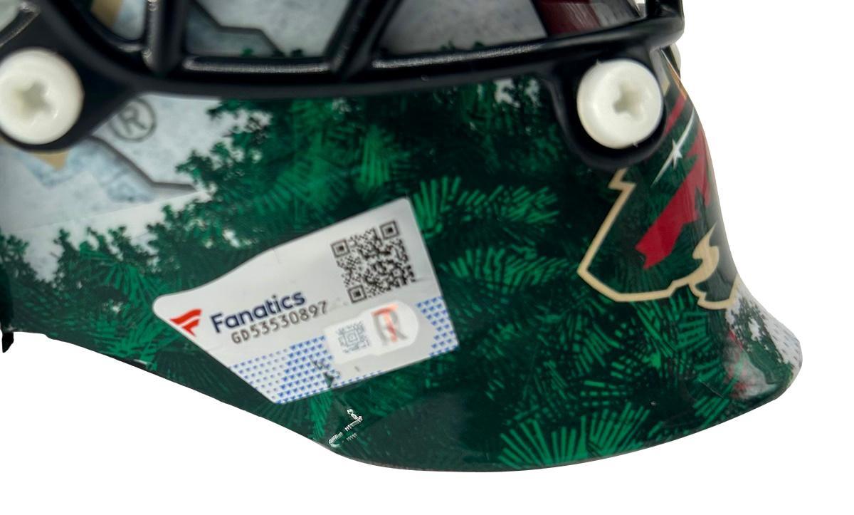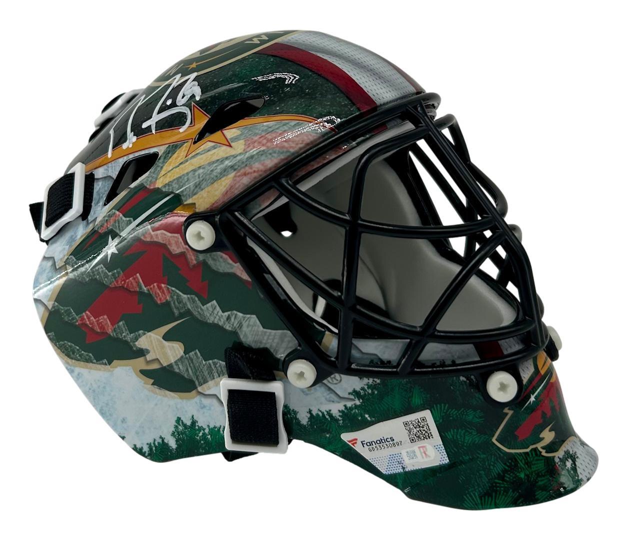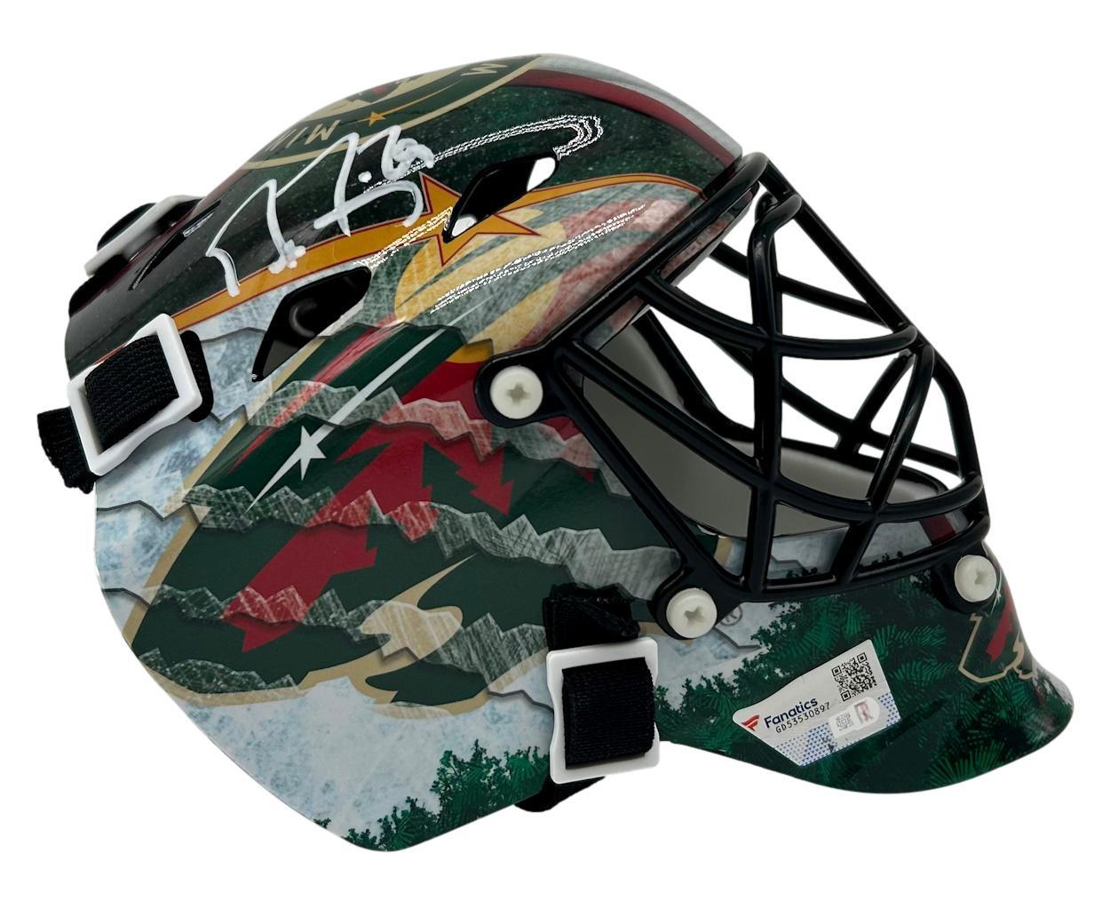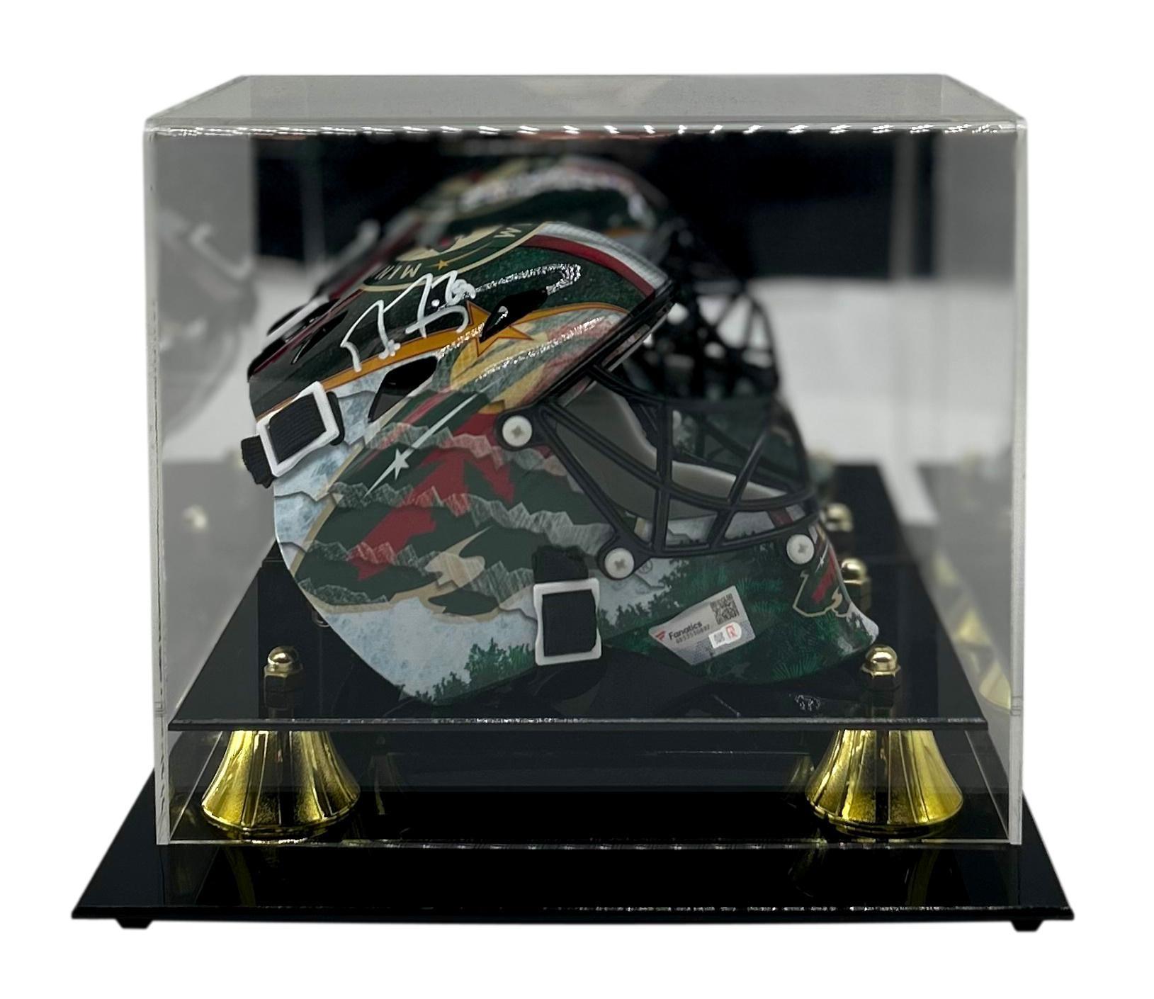 Minnesota Wild mini replica goalie mask. Hand-signed by Marc-Andre Fleury (Minnesota Wild). Display case is included as shown.