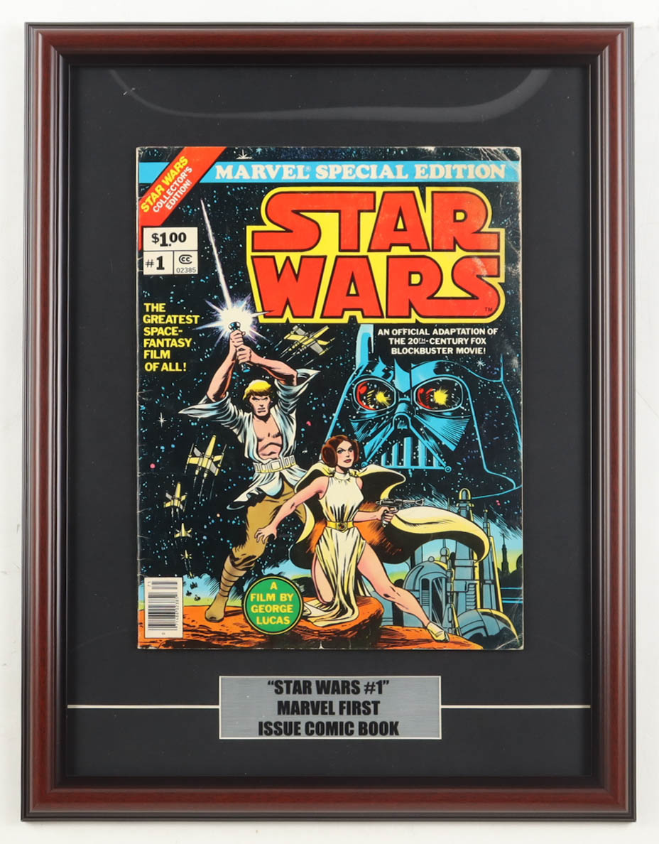 Custom frame measures approximately 16" x 21" in size and features the 1977 "Star Wars" Issue #1 Special Edition Marvel Comic Book. Display also includes a title plaque. Please note, item is unsigned.