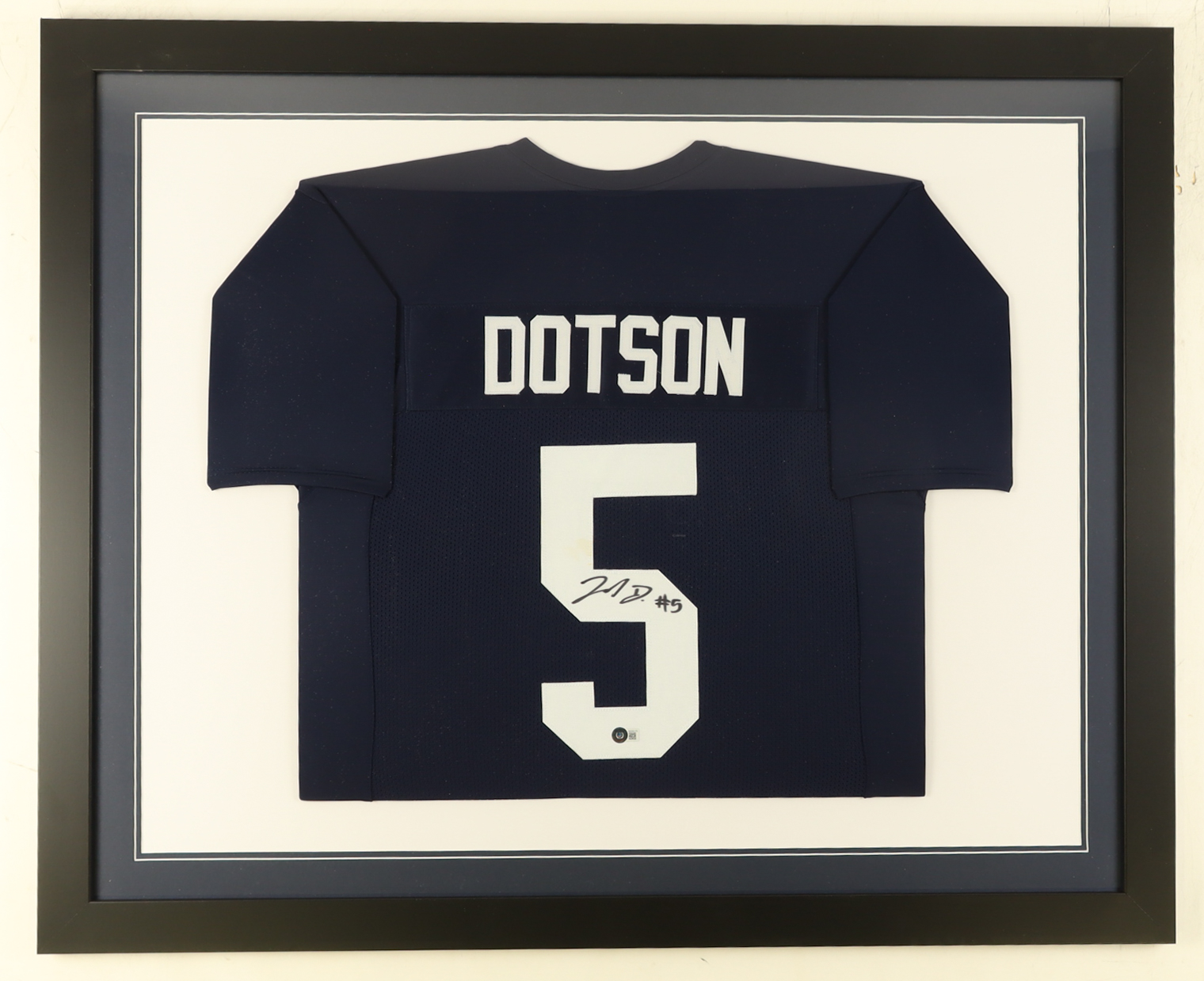 Custom framed display measures approximately 35" x 43" in size and features a jersey that has been hand-signed by Jahan Dotson.