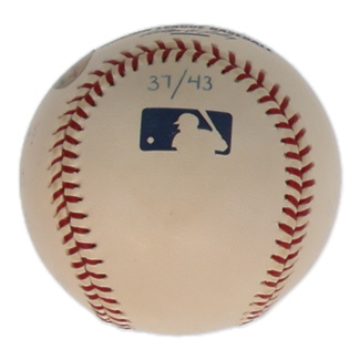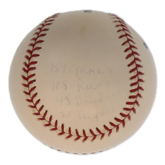 Please note, the baseball is stained and naturally toned, and the signature and inscriptions are severely faded.
