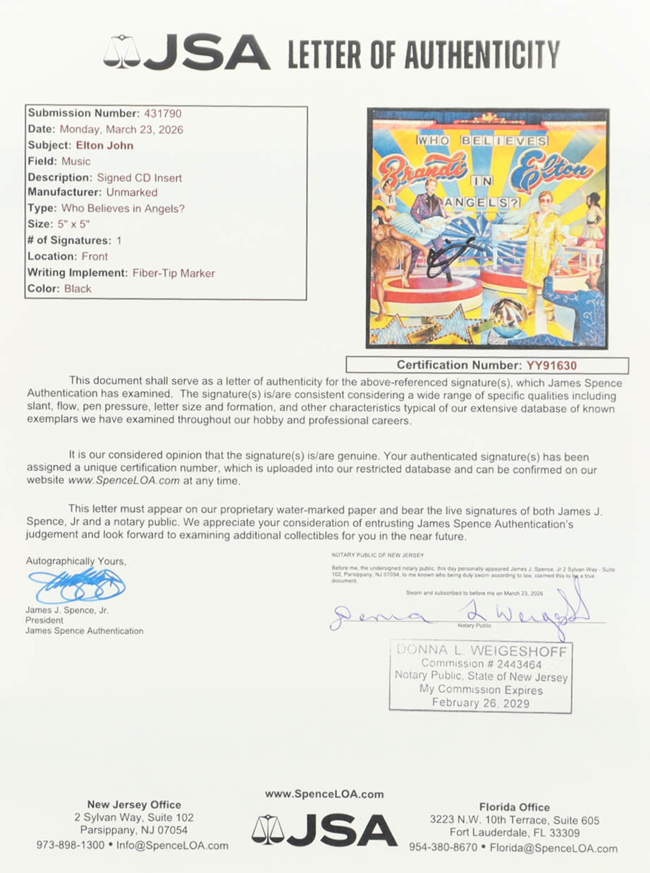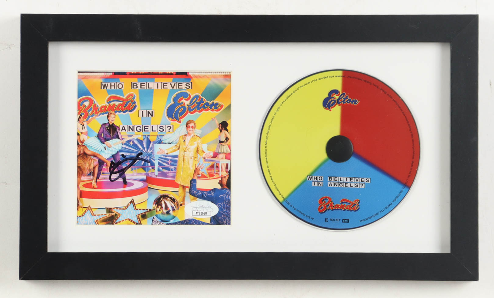 Custom frame measures approximately 8" x 13.5" in size and features a "Who Believes in Angels?" CD insert that has been hand-signed by Elton John. Refer to photo regarding the condition of the item.