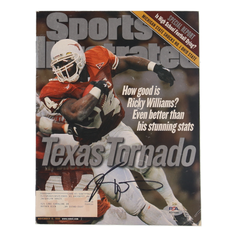 November 16th, 1998 Issue of Sports Illustrated Magazine. Hand-signed by Ricky Williams (Texas Longhorns). Please note, there are creases and scuffing throughout the magazine.