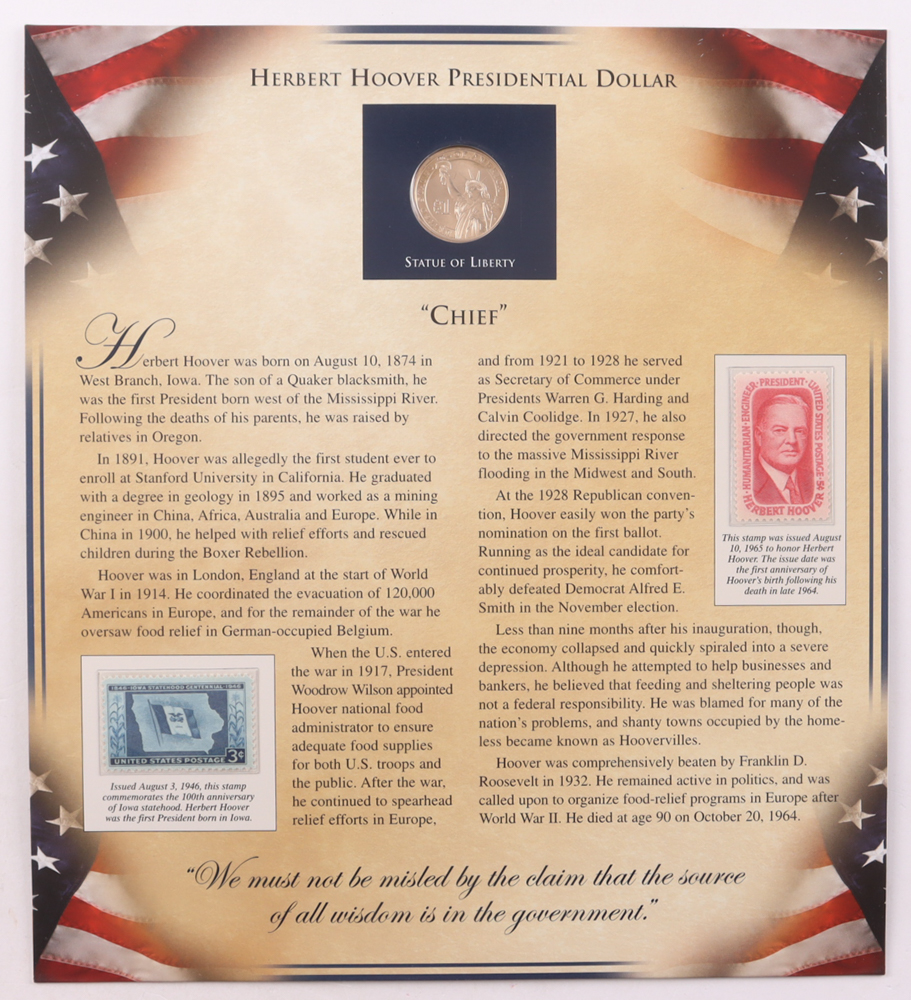Collection features 2014 Herbert Hoover 1$ dollar coin as well as (2) stamps issued in 1946 and 1964. See photos for more details on condition of the item.