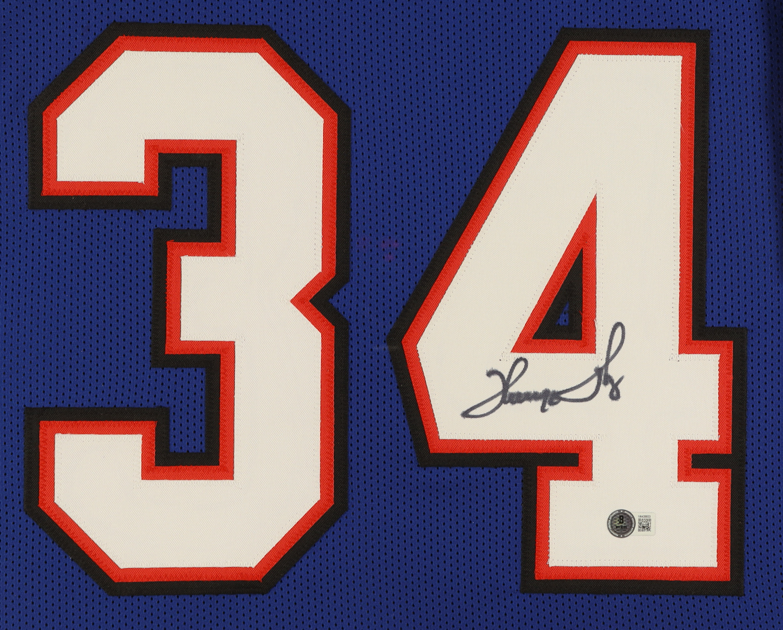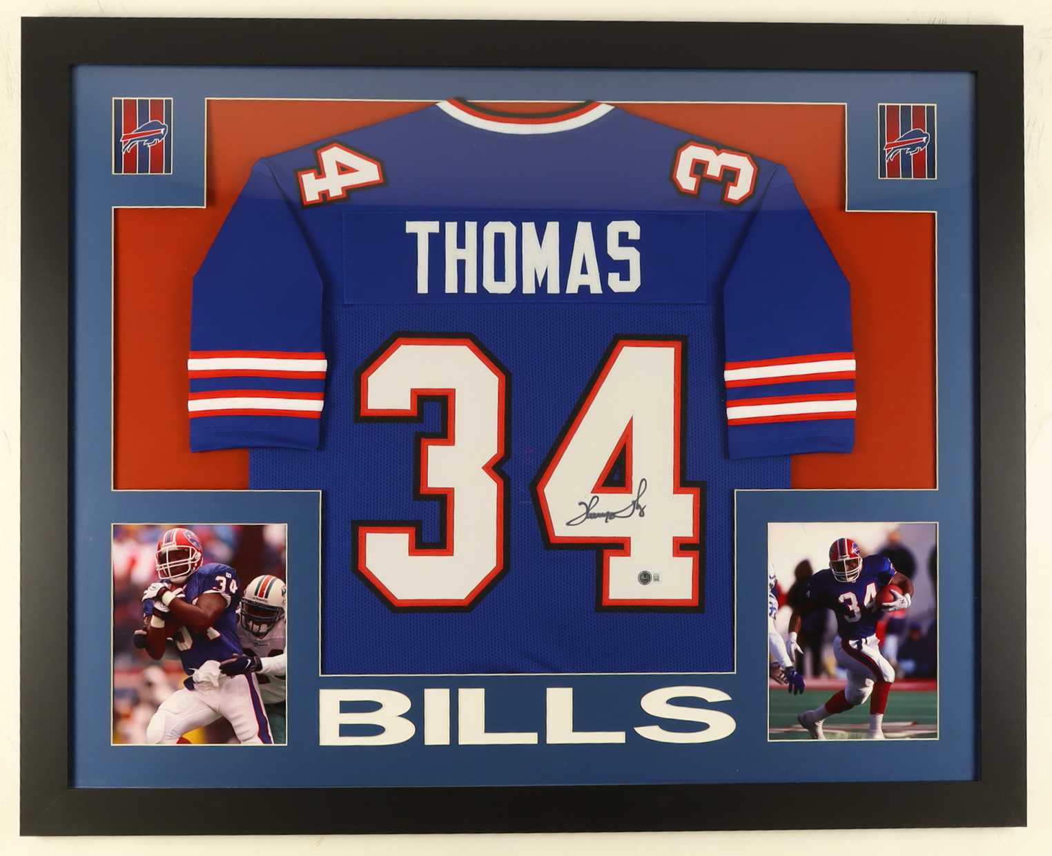 Custom frame measures 35" x 43" in size and features a jersey that has been hand-signed by Thurman Thomas (HOF).