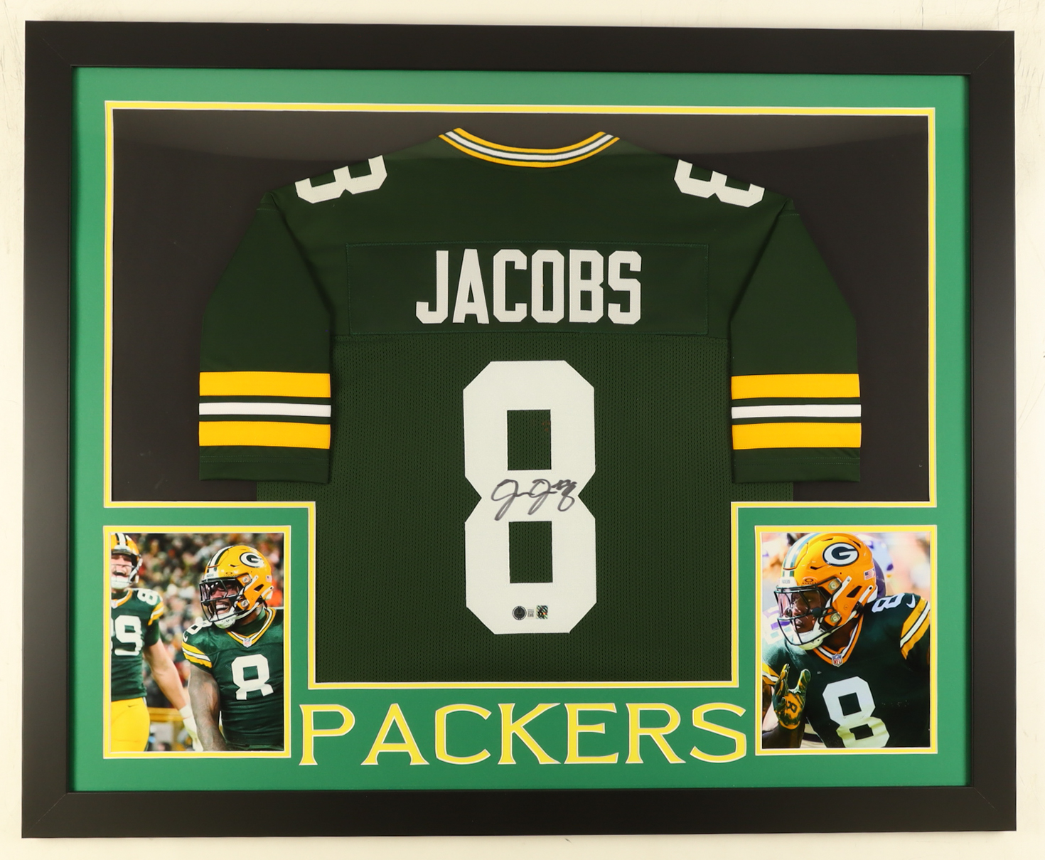 Custom frame measures approximately 35" x 43" in size and features a jersey that has been hand-signed by Josh Jacobs.