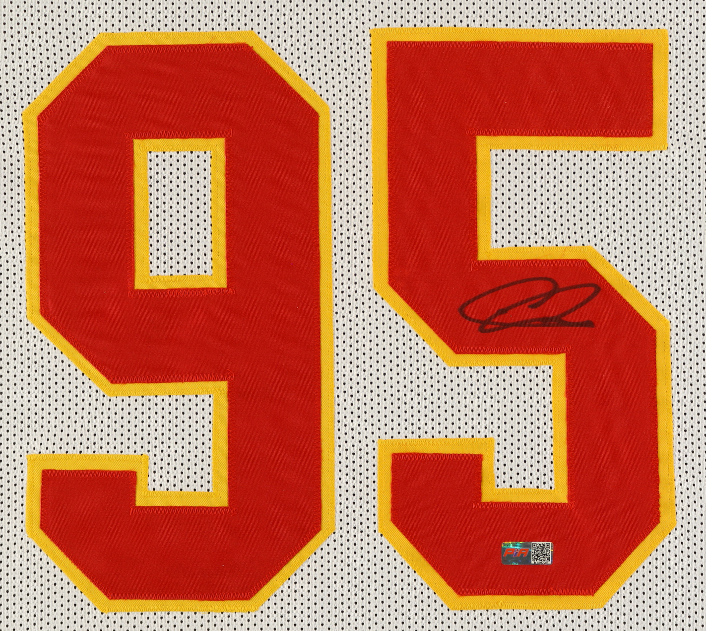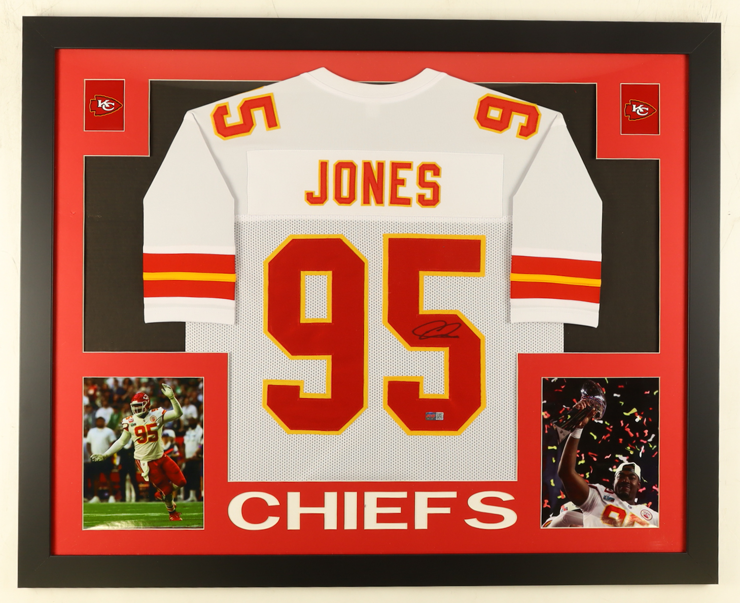 Custom frame measures approximately 35" x 43" in size and features a jersey hand-signed by Chris Jones.