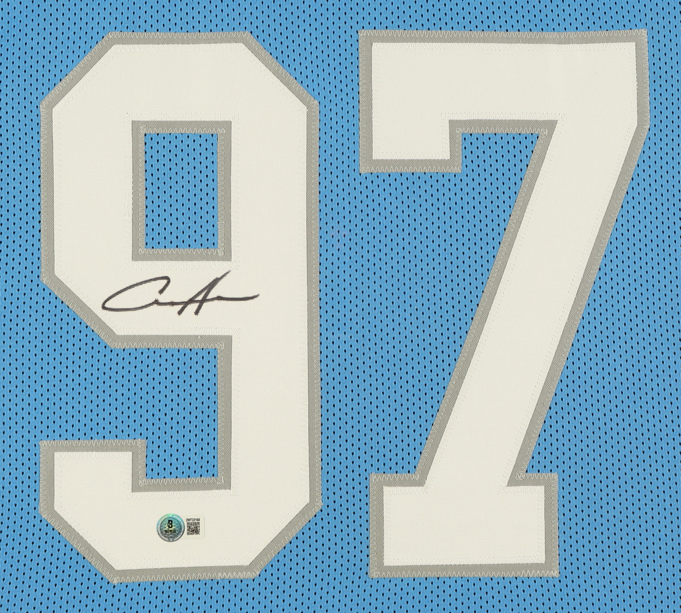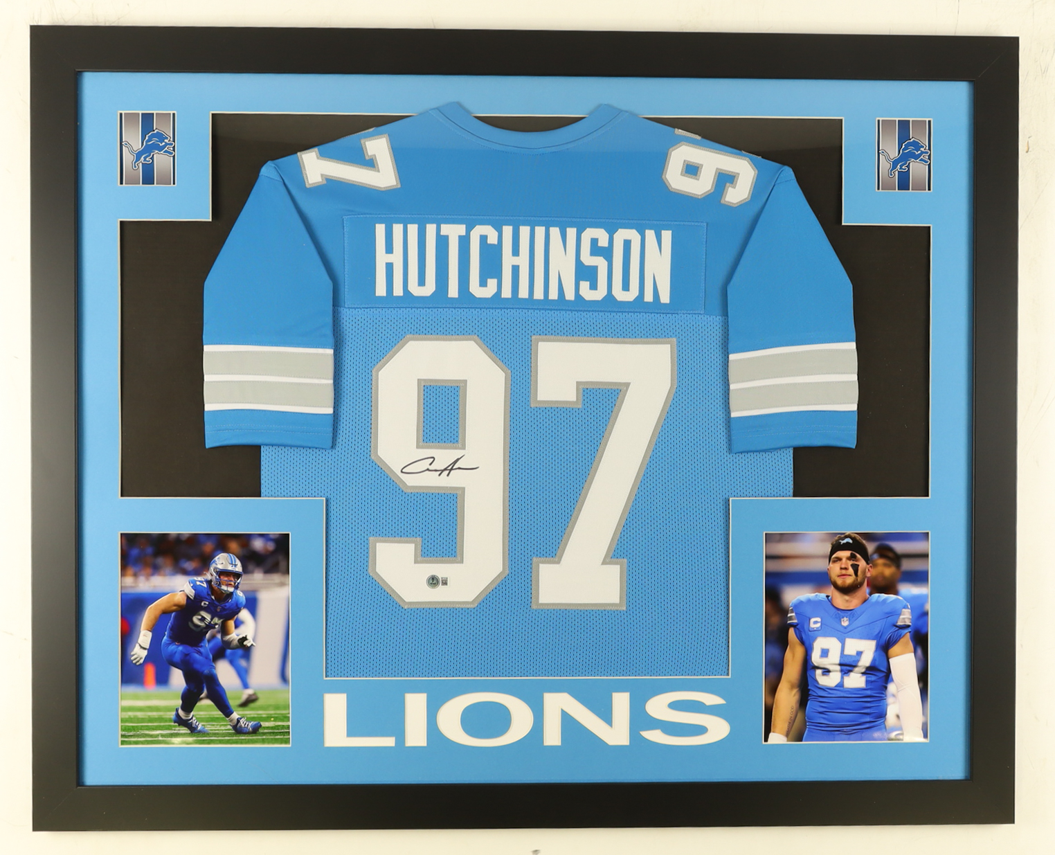 Custom frame measures approximately 35.5" x 43.5" in size and features a jersey that has been hand-signed by Aidan Hutchinson.