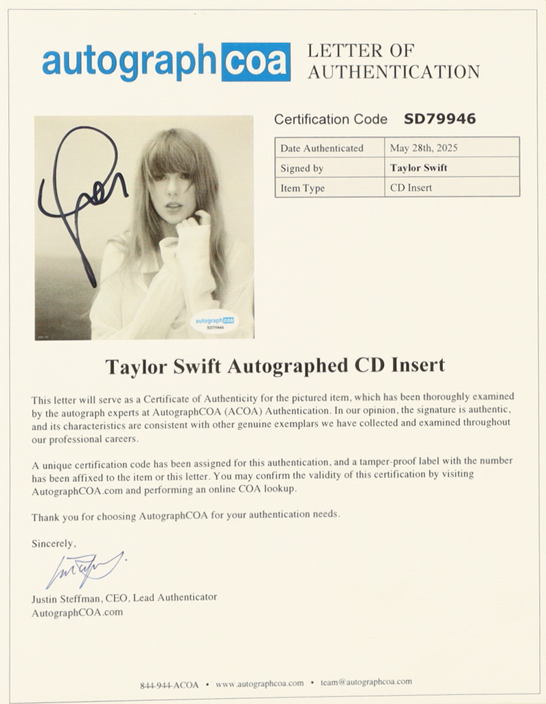 Matted insert display measures approximately 19" x 23" in size. Features a CD insert that has been hand-signed by Taylor Swift.