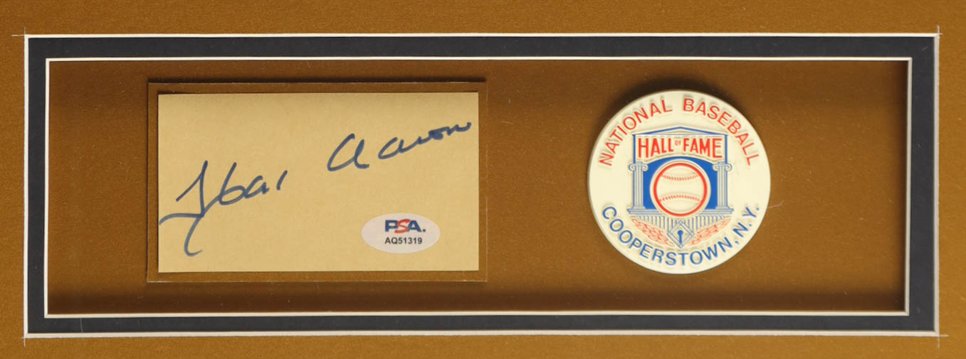Hank Aaron Signed Custom Framed Cut Display with Jersey & HOF Emblem (PSA)