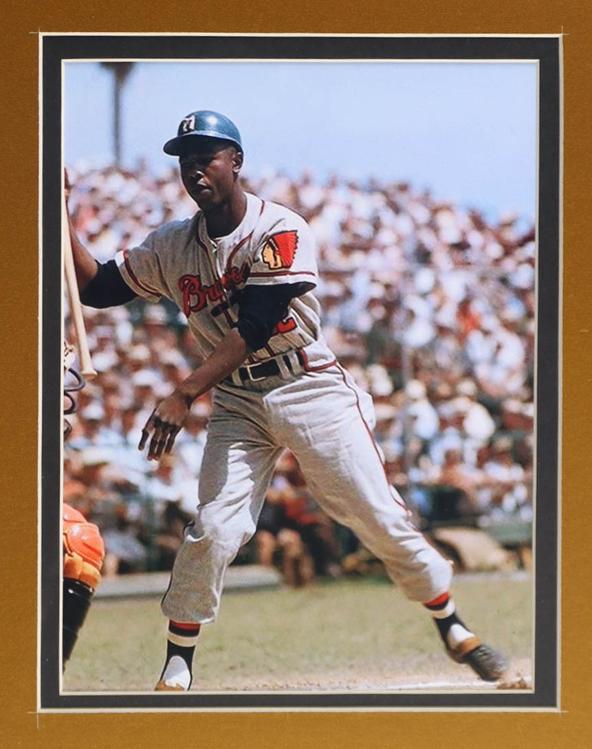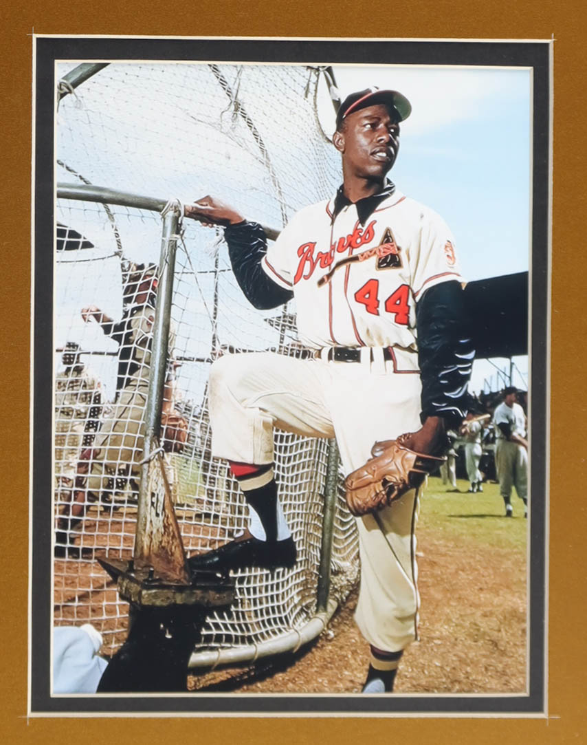 Custom frame display measures approximately 32" x 36" in size and features a jersey and a cut that has been hand-signed by Hank Aaron (D. 2021, HOF). The display also includes a Hall of Fame emblem, (2) 8" x 10" photos and (2) cloth team logo patches. Please see photos for more details regarding the condition of the item.