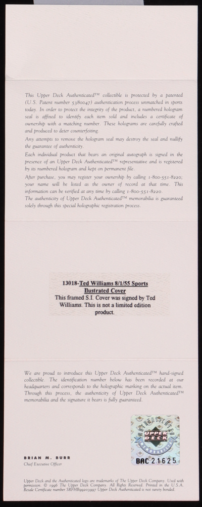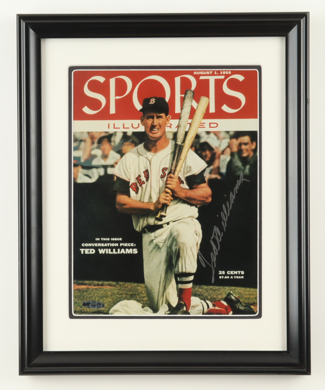 Custom frame measures 13” x 16” in size and features a 1955 Sports Illustrated cover that has been hand-signed by Ted Williams (D. 2002, Boston Red Sox, HOF). Please see photos for more details on condition of item.