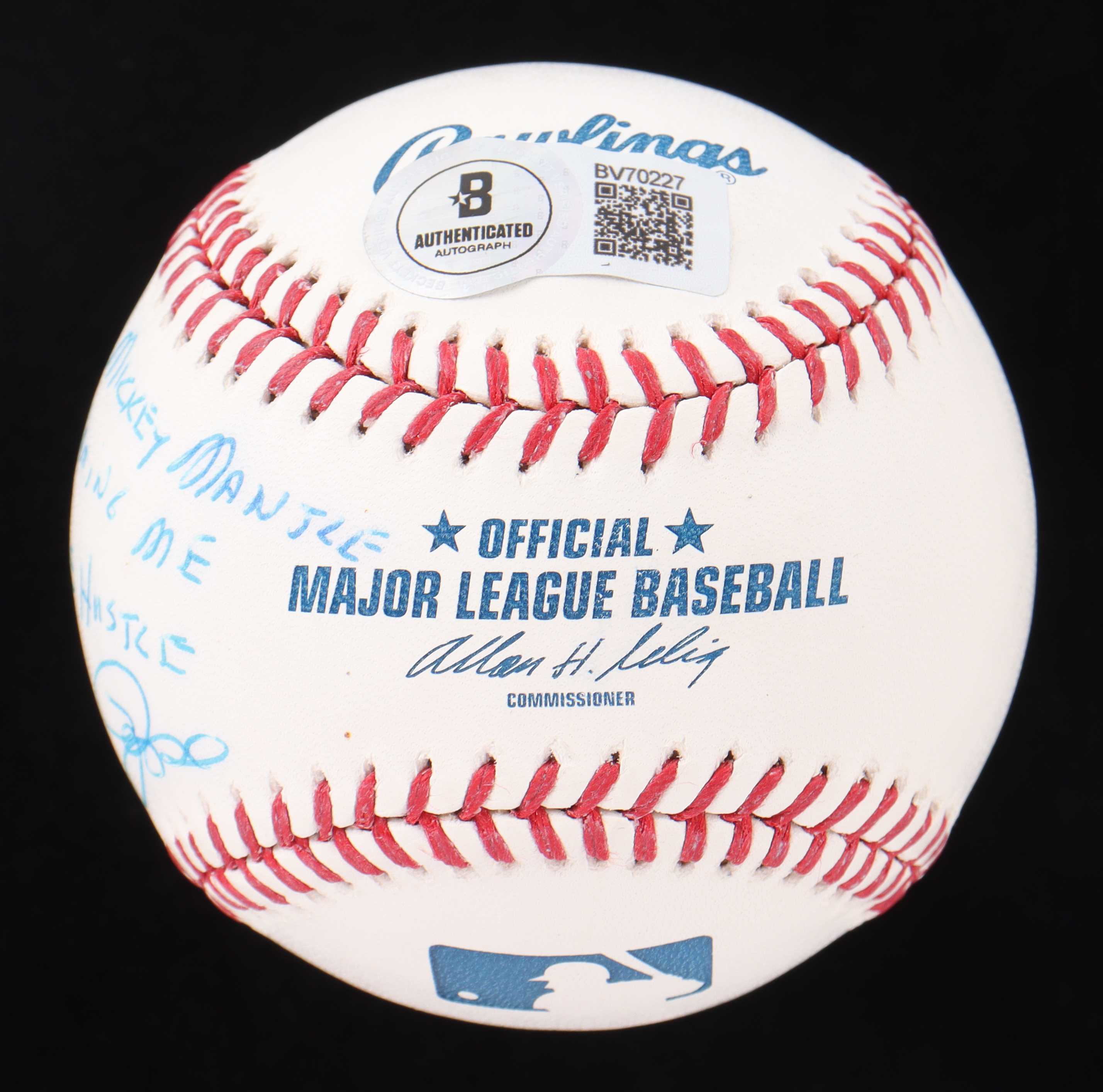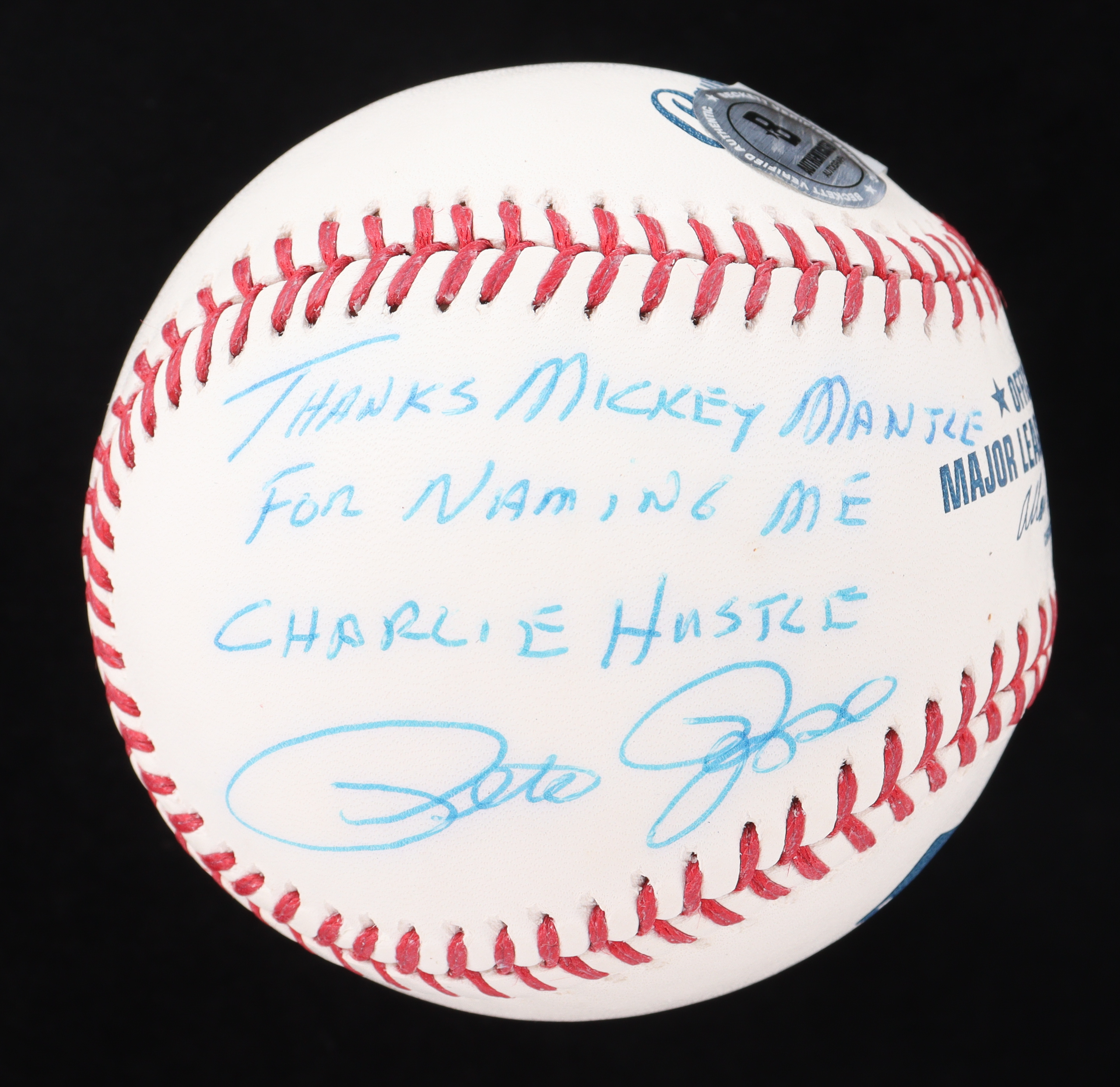 Pete Rose Signed OML Baseball Inscribed "Thanks Mickey Mantle for Naming Me Charlie Hustle" (Beckett)