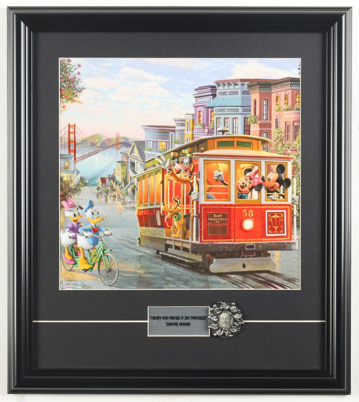 Thomas Kinkade "Mickey & Friends in San Francisco" Custom Framed Art Print Display with Retired Multi Character Pin