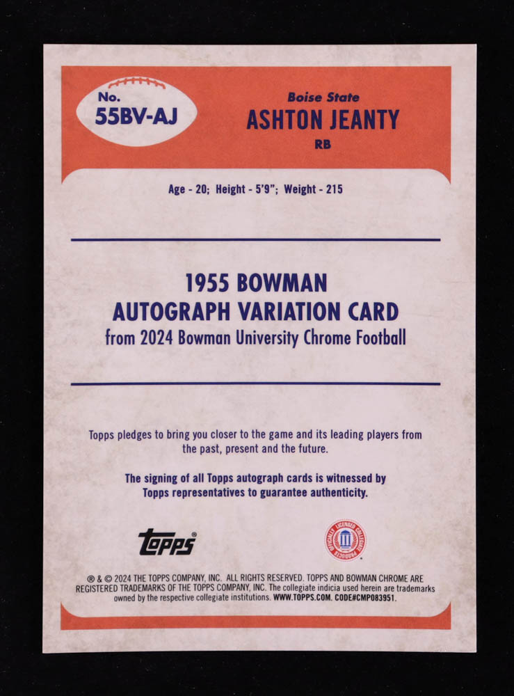 Ashton Jeanty 2024 Bowman Chrome University '55 Bowman Autographs #55B21 RC #56/99