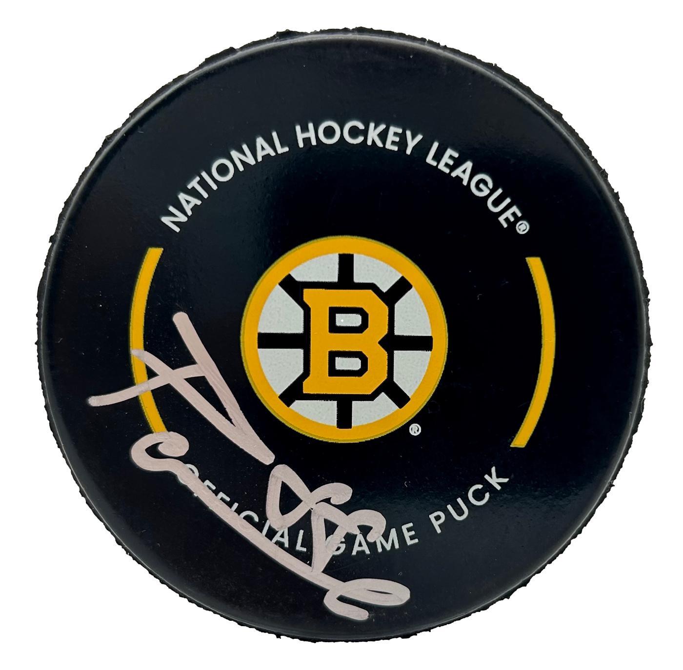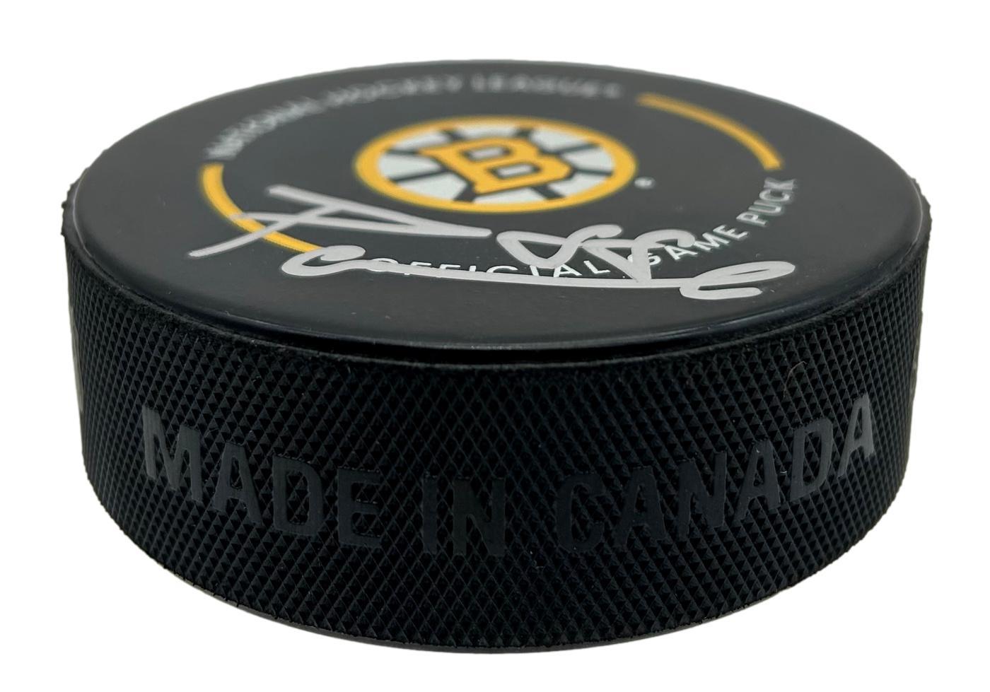 Boston Bruins Official Game hockey puck. Hand-signed by David Pastrnak.