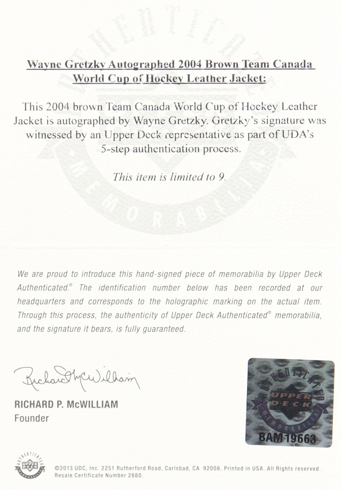 The jacket includes an official Upper Deck Authenticated (UDA) hologram and matching COA for authenticity purposes.
