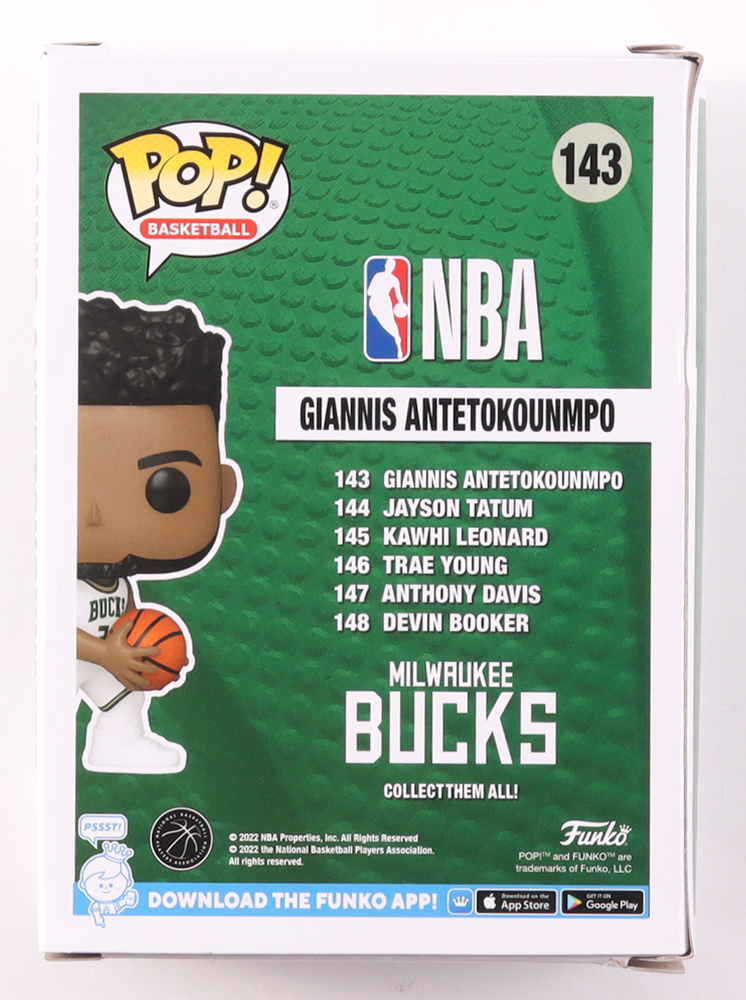 Funko Pop! vinyl figure measures approximately 4" in height and has been hand-signed on the packaging by Giannis Antetokounmpo (Milwaukee Bucks).