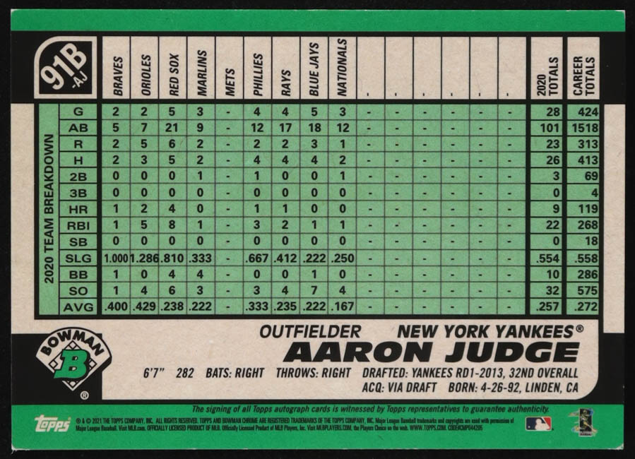Aaron Judge 2021 Bowman Chrome '91 Bowman Autographs Refractors #91BAJ #15/30