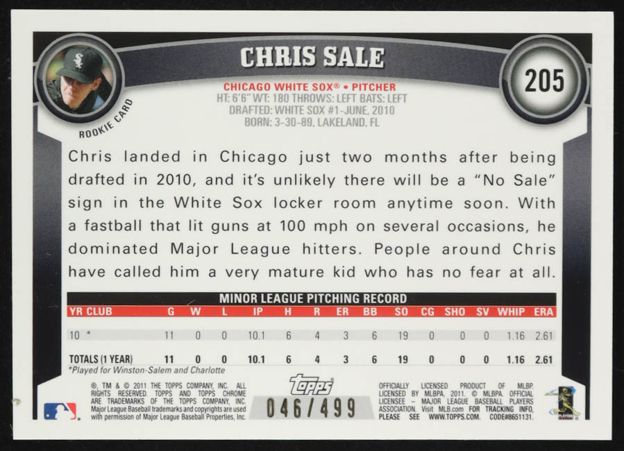 Chris Sale 2011 Topps Chrome Rookie Autographs Refractors #205 #046/499 RC