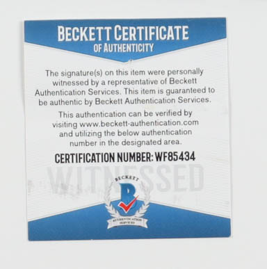 The autograph includes an official Beckett Authentication Services serially-numbered hologram and matching COA for authenticity purposes. The signing of this item was witnessed by Beckett.
