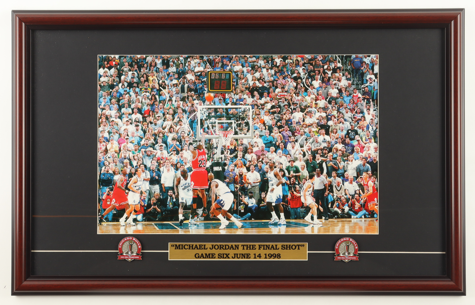 Custom framed display measures approximately 17" x 27" in size and features an 11" x 17" photo depicting Michael Jordan (Chicago Bulls, HOF). The display also includes (2) NBA Finals pins. Note that the display is unsigned. Please see photos for more details regarding the condition of the item.