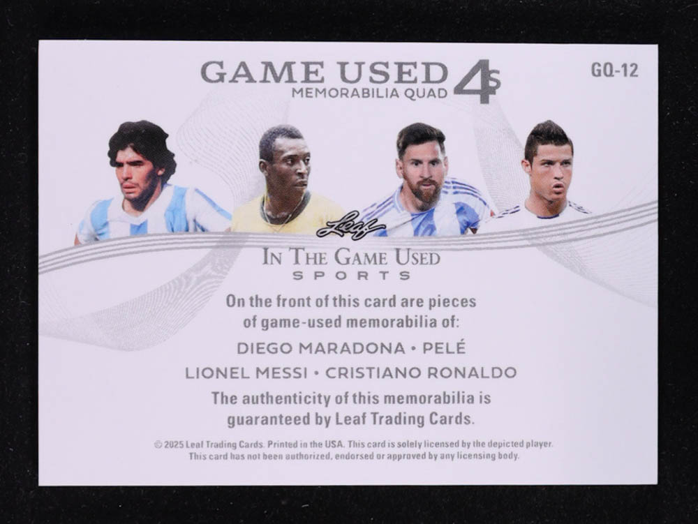 Diego Maradona / Pele / Lionel Messi / Cristiano Ronaldo 2025 Leaf ITG Used Sports Game Used Quads Blue #GQ12 #15/35