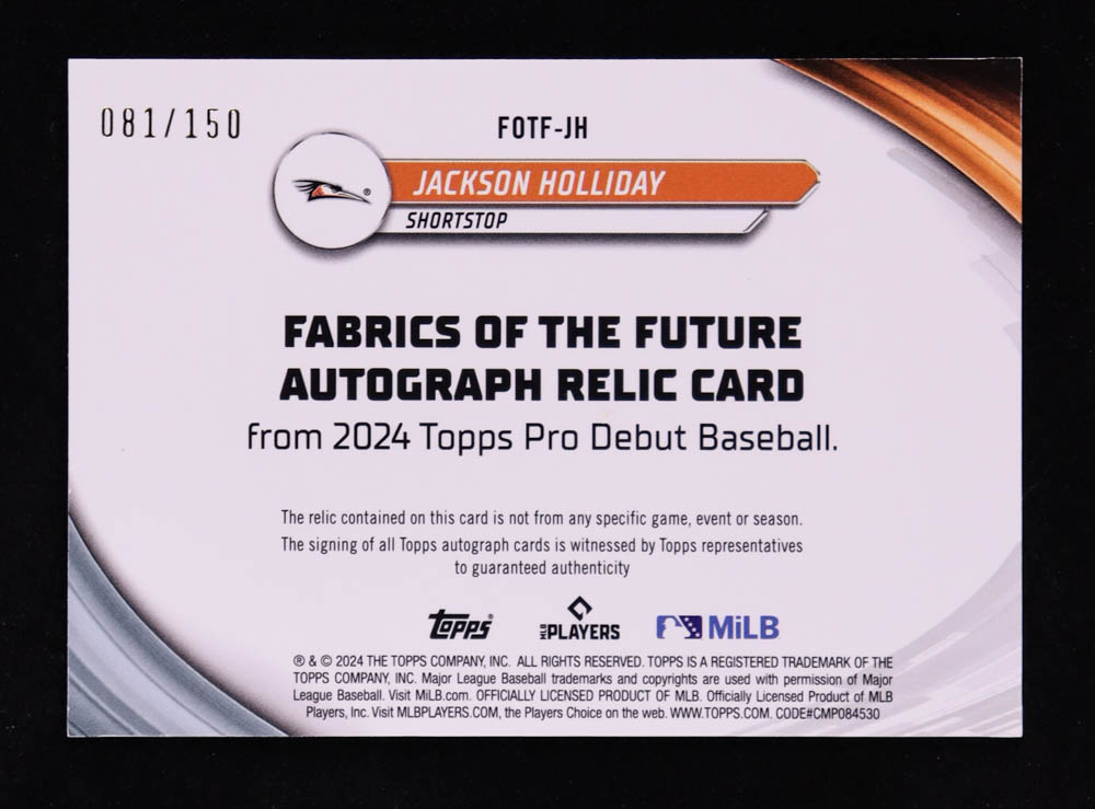 Jackson Holliday 2024 Topps Pro Debut Fabrics of the Future Autograph Relics Blue #FOTFJH RC #081/150