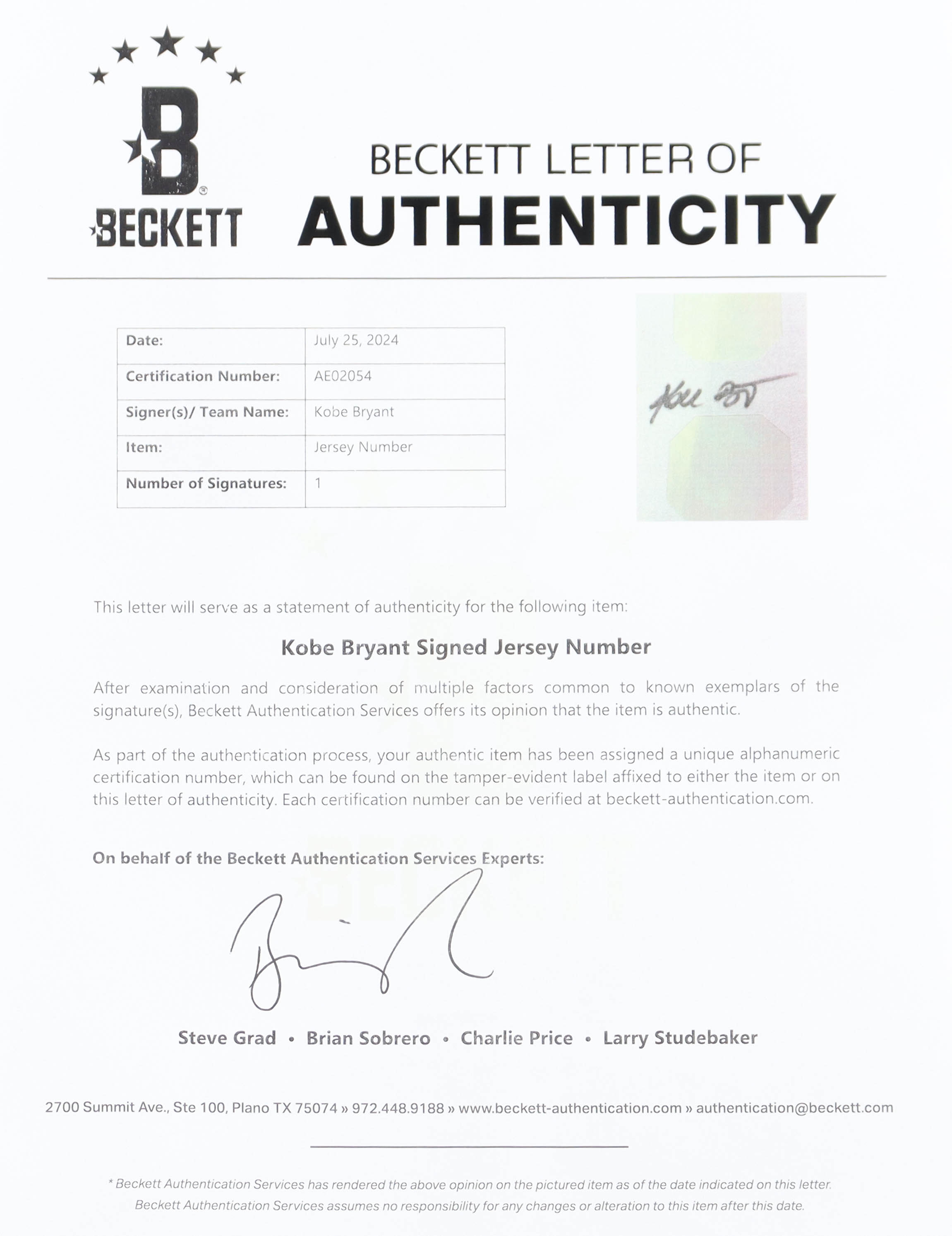 The jersey includes an official PSA/DNA hologram and matching COA as well as an official Beckett Authentication Services hologram and matching LOA for authenticity purposes.