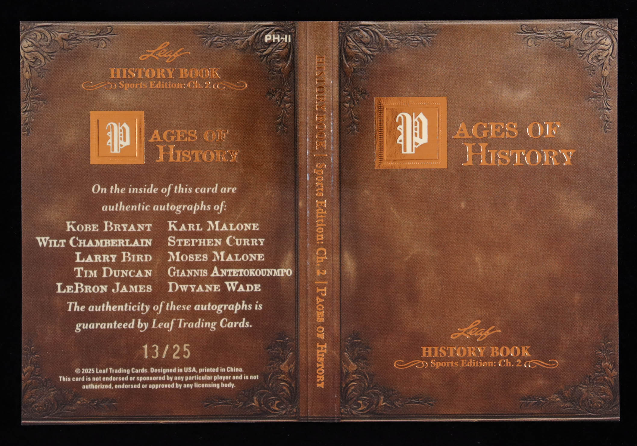 Kobe Bryant / Wilt Chamberlain / Larry Bird / Tim Duncan / LeBron James / Karl Malone / Stephen Curry / Moses Malone / Giannis Antetokounmpo / Dwyane Wade 2025 Leaf History Book Sports Edition Chapter 2 The Pages of History Bronze Foil #PH11 #13/25