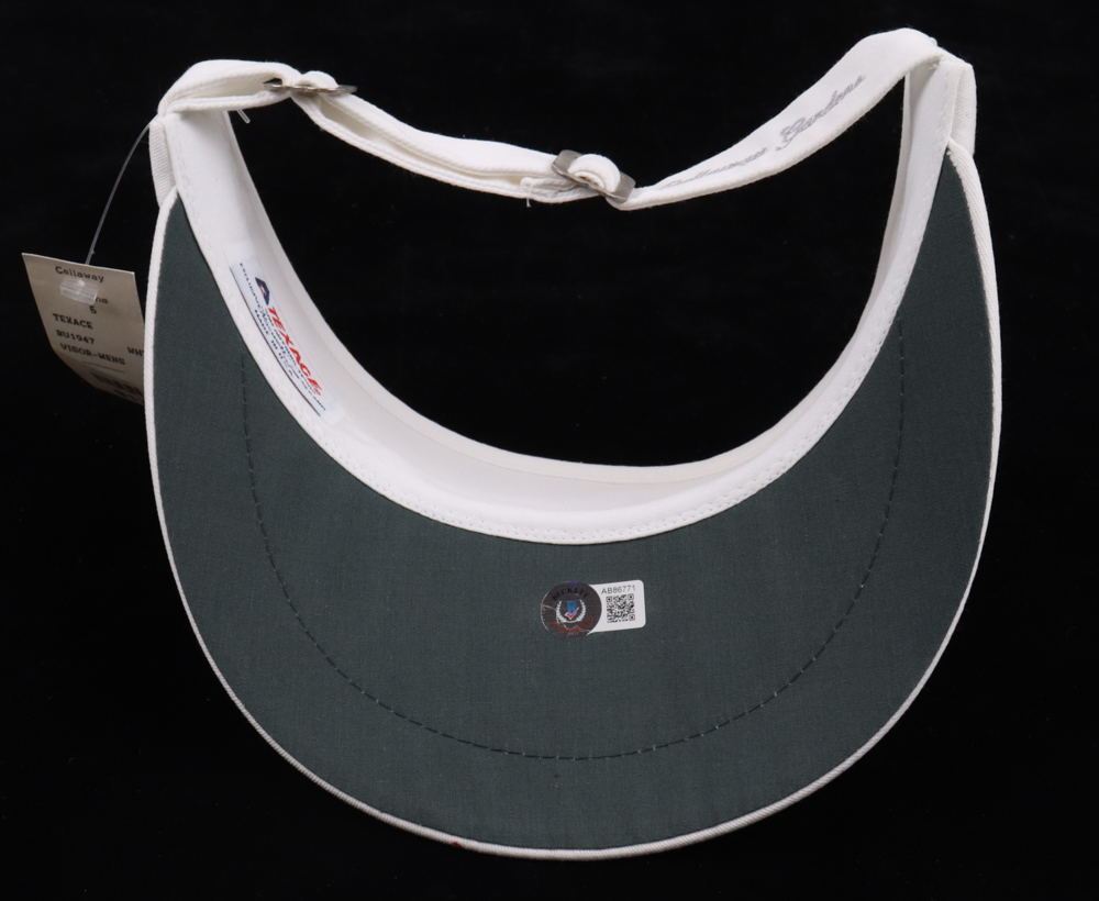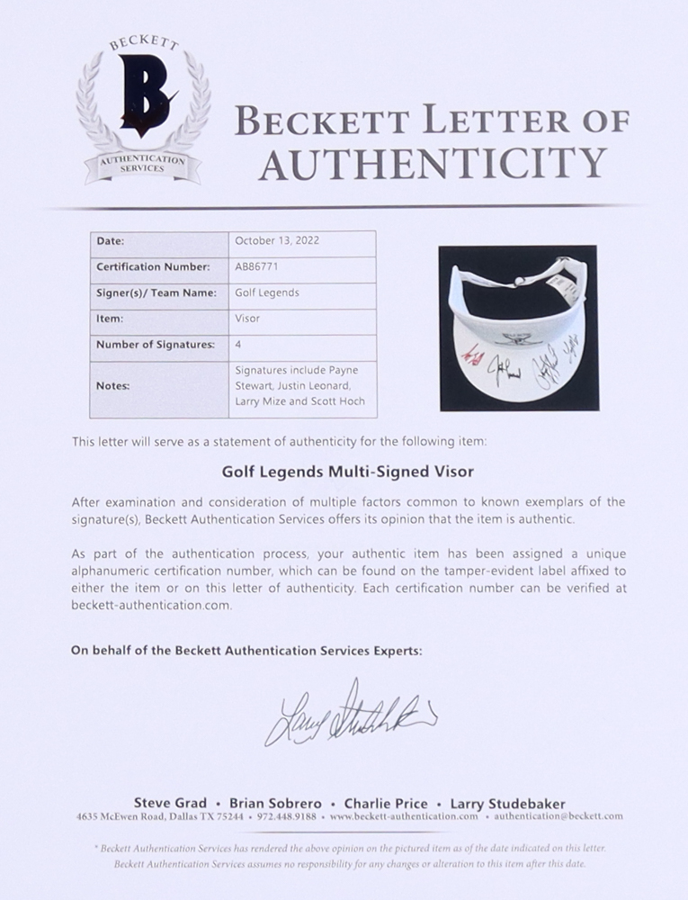 Visor has been hand-signed by (4) with Payne Stewart (D. 1999, HOF), Justin Leonard, Larry Mize and Scott Hoch.