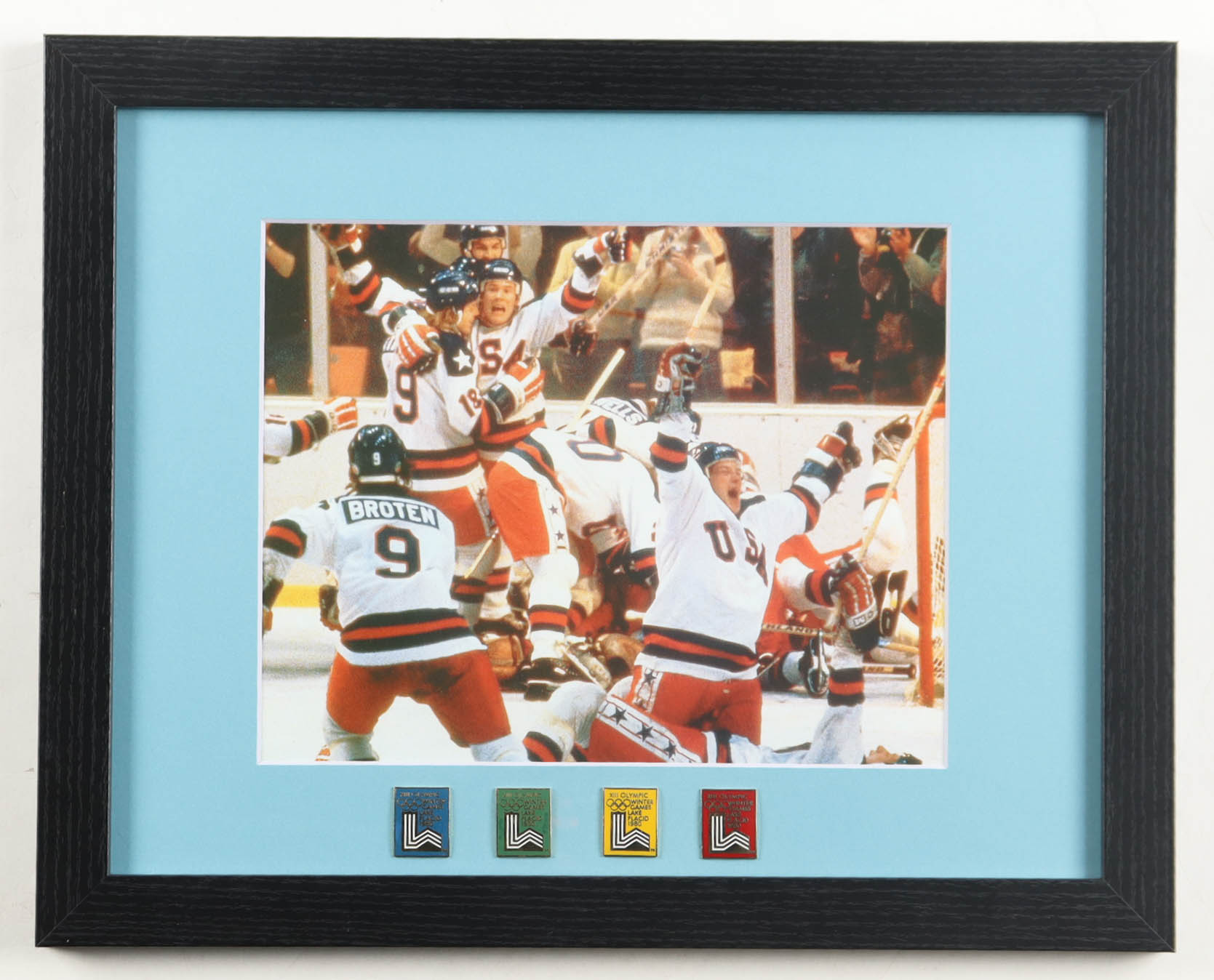 Custom frame measures 13" x 16" in size featuring an 8" x 10" photo. Please see photos for details regarding the item. Display also includes a set of (4) Lake Placid Olympic pins. Note that the item is unsigned.