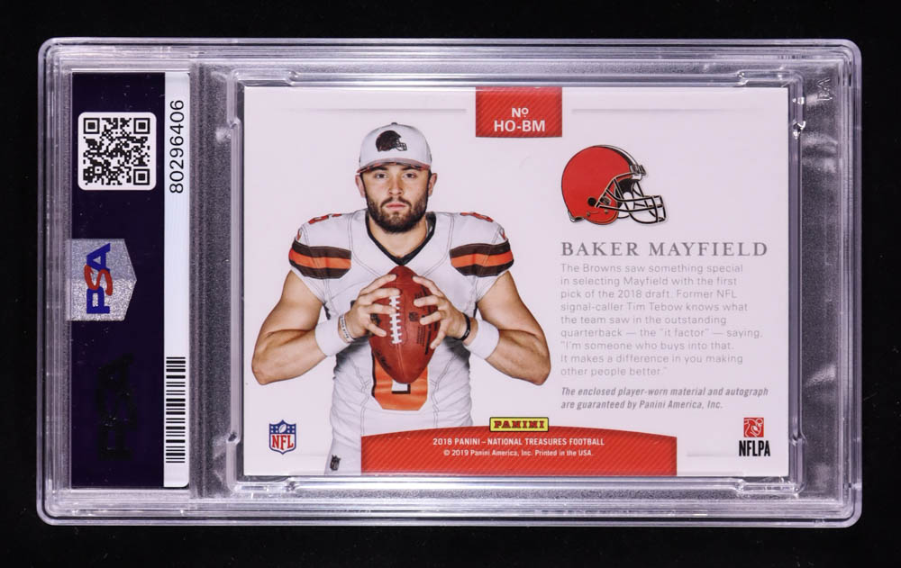 Baker Mayfield 2018 Panini National Treasures Rookie Hats Off Signatures NFL Shield #1 RC #3/3 (PSA 8)