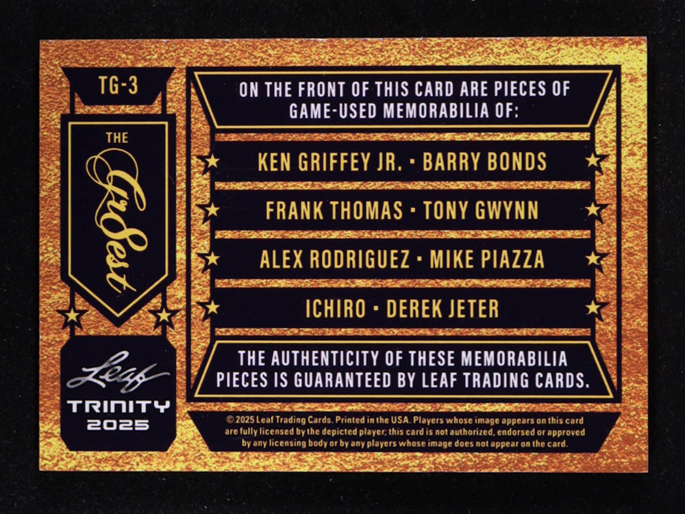 2025 Leaf Trinity Gr8est Blue #TG3 Ken Griffey Jr. / Barry Bonds / Alex Rodriguez / Mike Piazza / Frank Thomas / Tony Gwynn / Ichiro Suzuki / Derek Jeter #24/25