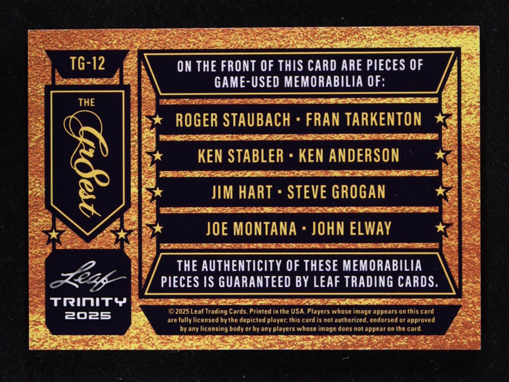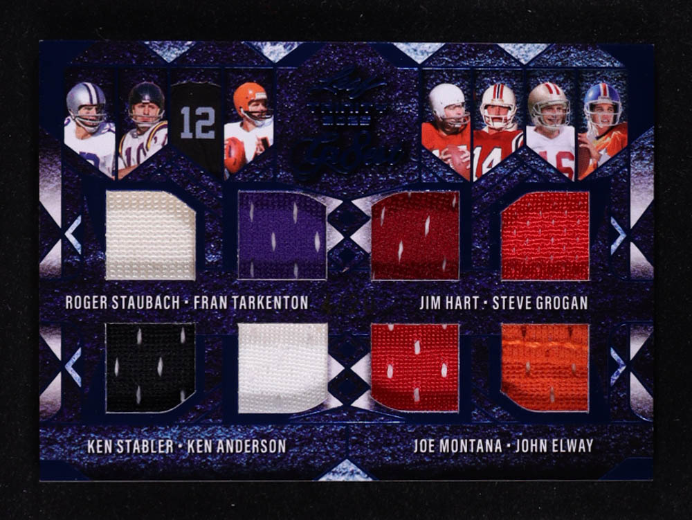2025 Leaf Trinity The Gr8est Memorbaliia Blue #TG12 Roger Staubach / Fran Tarkenton / Ken Stabler / Ken Anderson / Jim Hart / Steve Grogan / Joe Montana / John Elway #04/20
