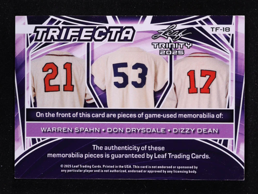 Warren Spahn / Don Drysdale / Dizzy Dean 2025 Leaf Trinity Trifecta Memorabilia Gold #TF18 #1/1