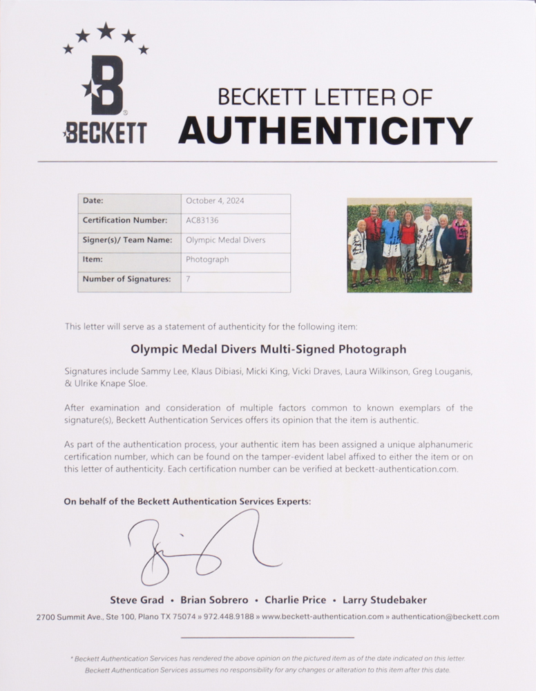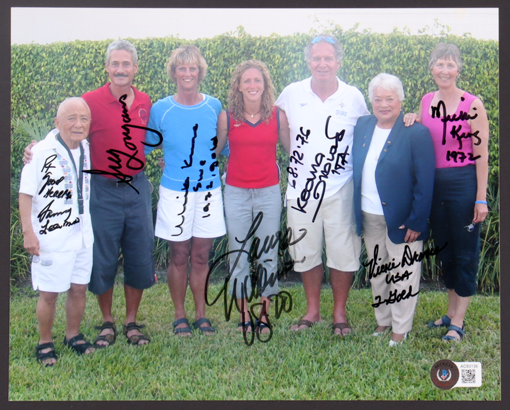 Photo measures 8" x 10" in size. Hand-signed and inscribed by (7) including Greg Louganis, Vicki Draves, Millie King, Laura Wilkinson, Klaus Dibias, Sammy Lee, and Ulrike Knape Sloe