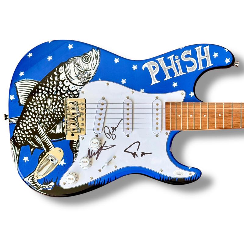 Custom Autograph Edition Stratocaster style electric guitar measures approximately 39" in length and has been hand-signed on the pickguard by Trey Anastasio (lead singer & guitarist), Page McConnell (lead keyboardist), and Mike Gordon (lead bassist).