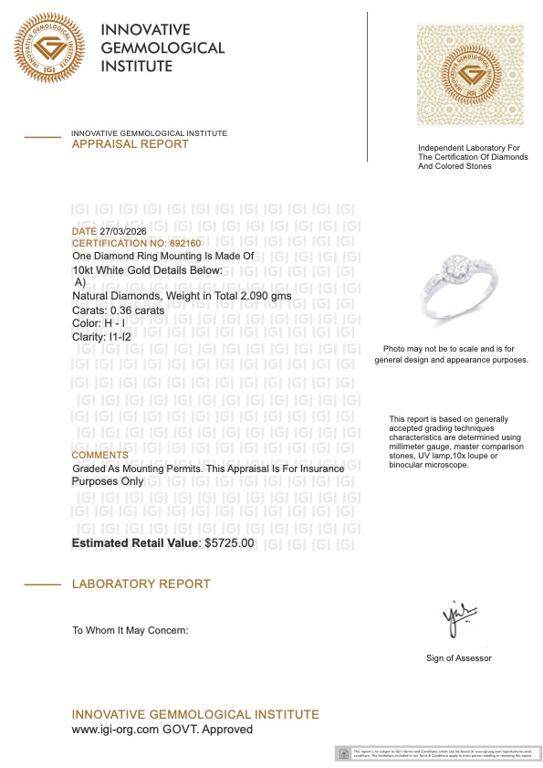 This piece includes paperwork from the Innovative Gemological Institute (IGI).