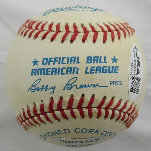 Rawlings Official American League baseball. Hand-signed and inscribed by Reggie Jackson (New York Yankees, HOF). Please note, ball has been naturally stained and toned.