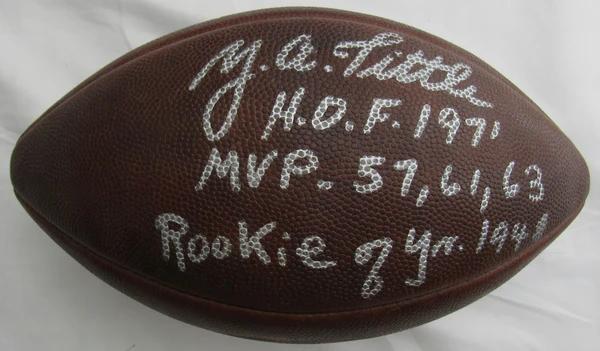 Y.A Tittle Signed NFL Football Inscribed "HOF 1971", "MVP 57, 61, 63" & "Rookie of the Year 1948" (JSA)